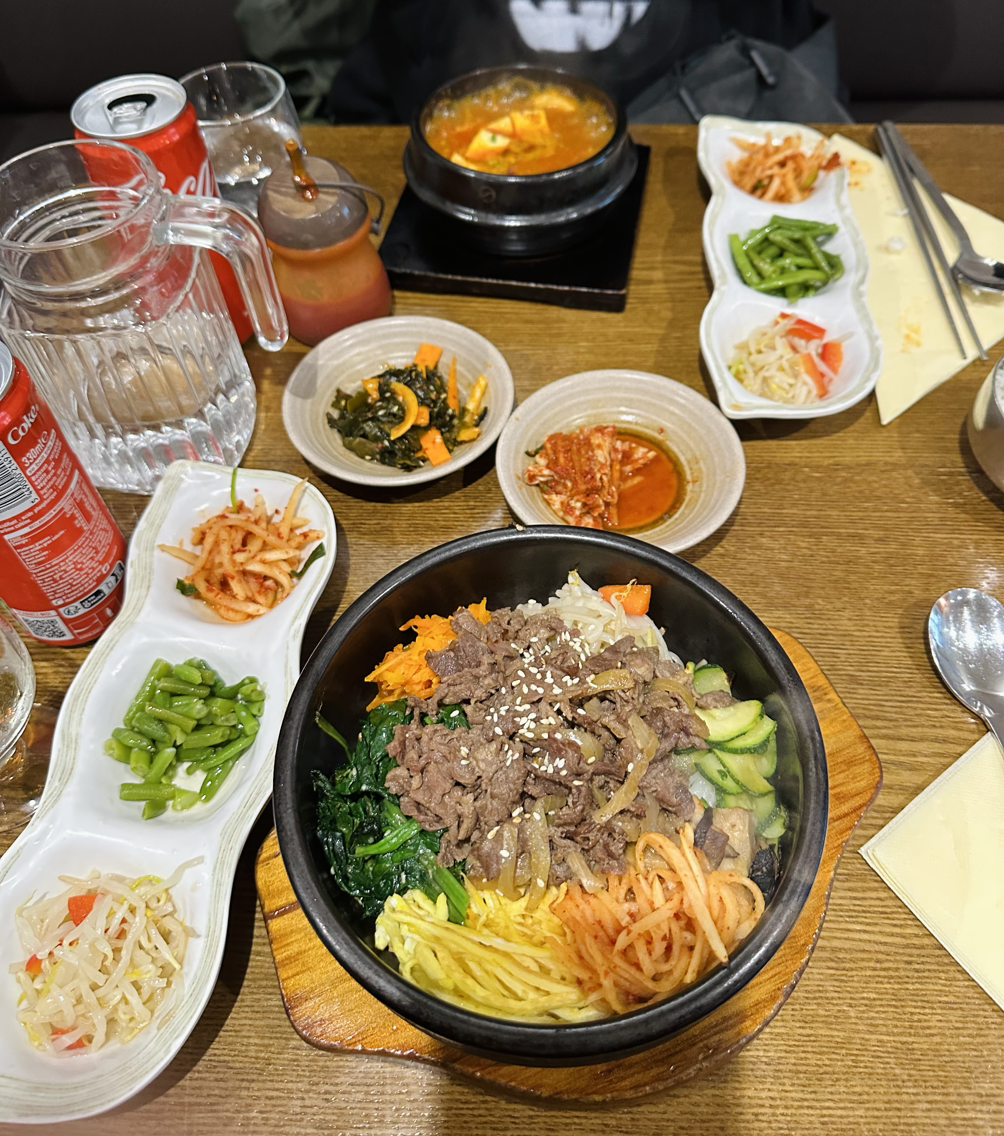 메뉴를 보자마자 김치찌개, 비빔밥, 제육볶음을 주문하고, 시원하게 물 한잔 마셨다. 미리 서브 된 나물 반찬을 각자 자기 앞에 하나씩 두고 젓가락으로 에피타이저를 즐기는 외국인들이 흥미롭다. 반대로, 우린 그들의 식사처럼 밥 먹으며 대화 시간이 늘었다. 한국에서 보다 식사 시간이 배로 늘었다. 메인 요리가 하나씩 늘때마다 수빈이는 엄지를 세운다. 맛도 훌륭하다. 제법 빨간 김치찌개의 뽀얀 두부가 이리 반가울 수가 없다. 약간 시큼한 맛의 김치찌개에는 토마토페이스트 향이 난다. 난 그 매력에 빠져 숟가락으로도 마실 수 있음을 알았다.