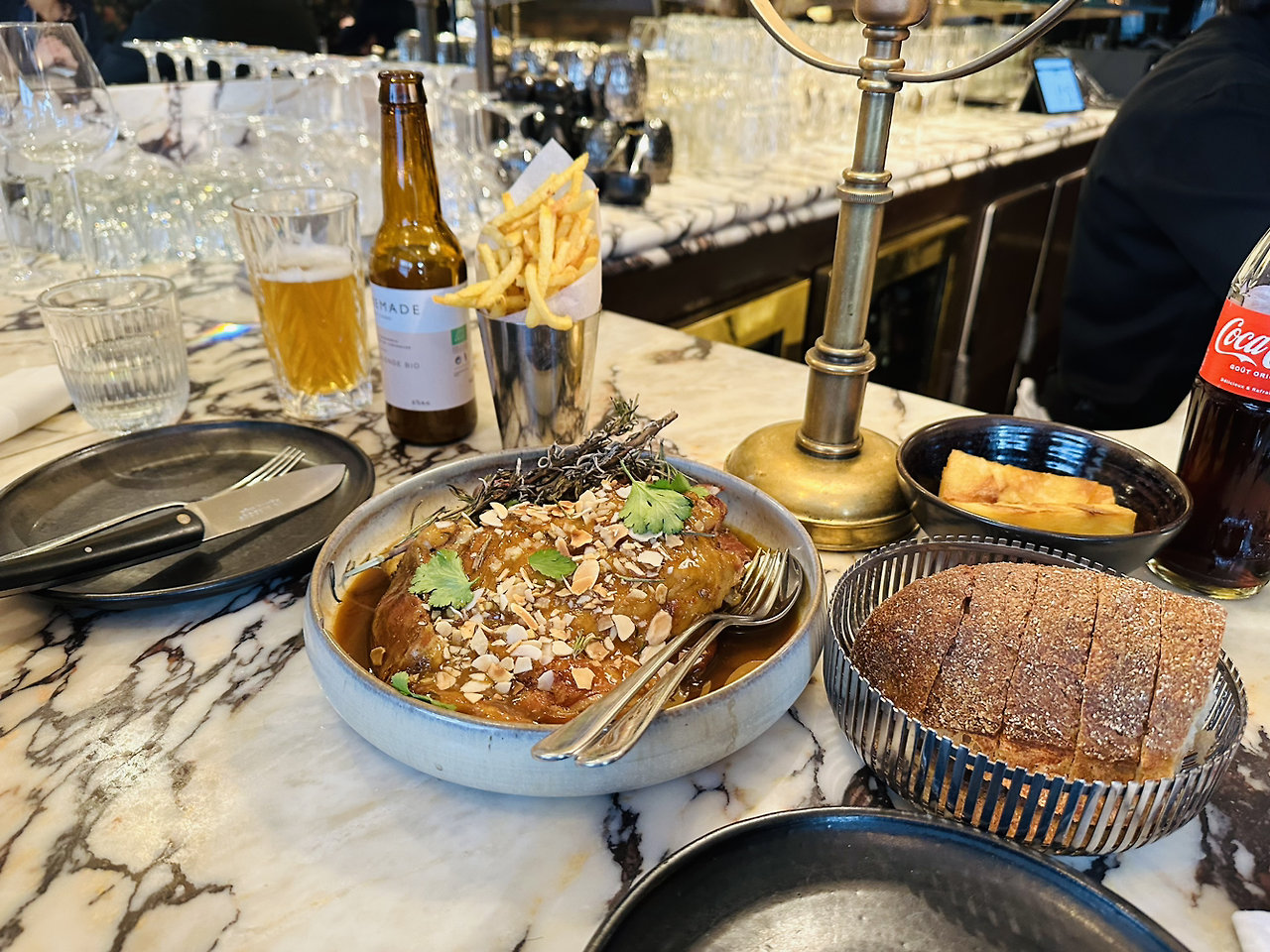 2인분이 함께 서빙되는 요리를 주문했다. 칵테일을 주문하니, 칵테일은 저녁 한정 메뉴라 길래 맥주 한 병을 시키고,스팀 된 양고기와, 프렌치 프라이, 크리스피 포테이토를 사이드로 주문하고, 음식이 나오기 전, 수제맥주를 한잔 시원하게 들이키는 순간, 온 몸이 나른 해지며 기분이 좋아 진다. 불타는 로즈 마리와 함께 서빙 된 스팀 양고기는 묘한 훈제 내음을 감싼 족발과 백숙 사이의 식감이었다. 매번 느끼지만, 음식 인심은 후한 파리인것 같다. 배부르게 먹었더니 계획한 디저트는 포기하기로 하고, 명품 상점 골목을 지나, 아시안 마트까지는 알아 놓고 숙소로 돌아왔다.