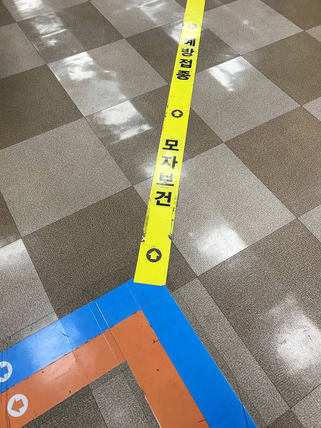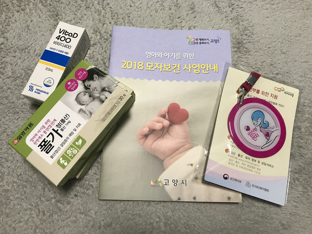 바닥에 표시된 노란 선을 따라 모자보건실로 가니, 신분증 확인 후 임산부 등록 상태를 확인하고 서류를 작성했다. 서류 작성을 마치니 3개월치 엽산제, 액상 비타민D, 임산부 뱃지, 사업 안내 브로셔를 챙겨주었다. 2019년도 모자보건 사업도 크게 다르지 않을 것이라며 안내서를 참고하라고 했다. 2019년 브로셔를 아직 받지는 못했지만, 온라인 상에 공개된 내용으로 확인한 바로는 큰 차이 없다.
