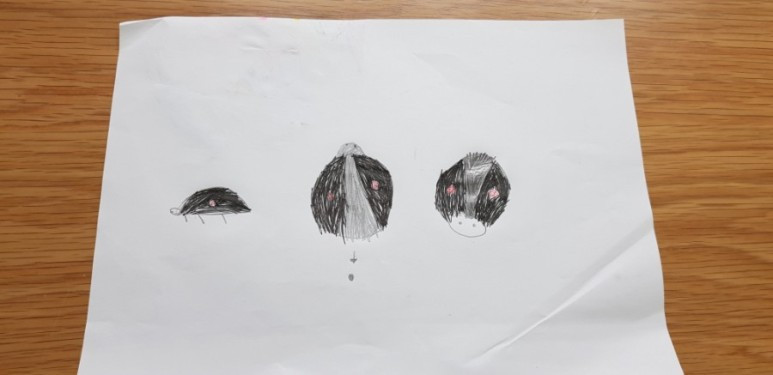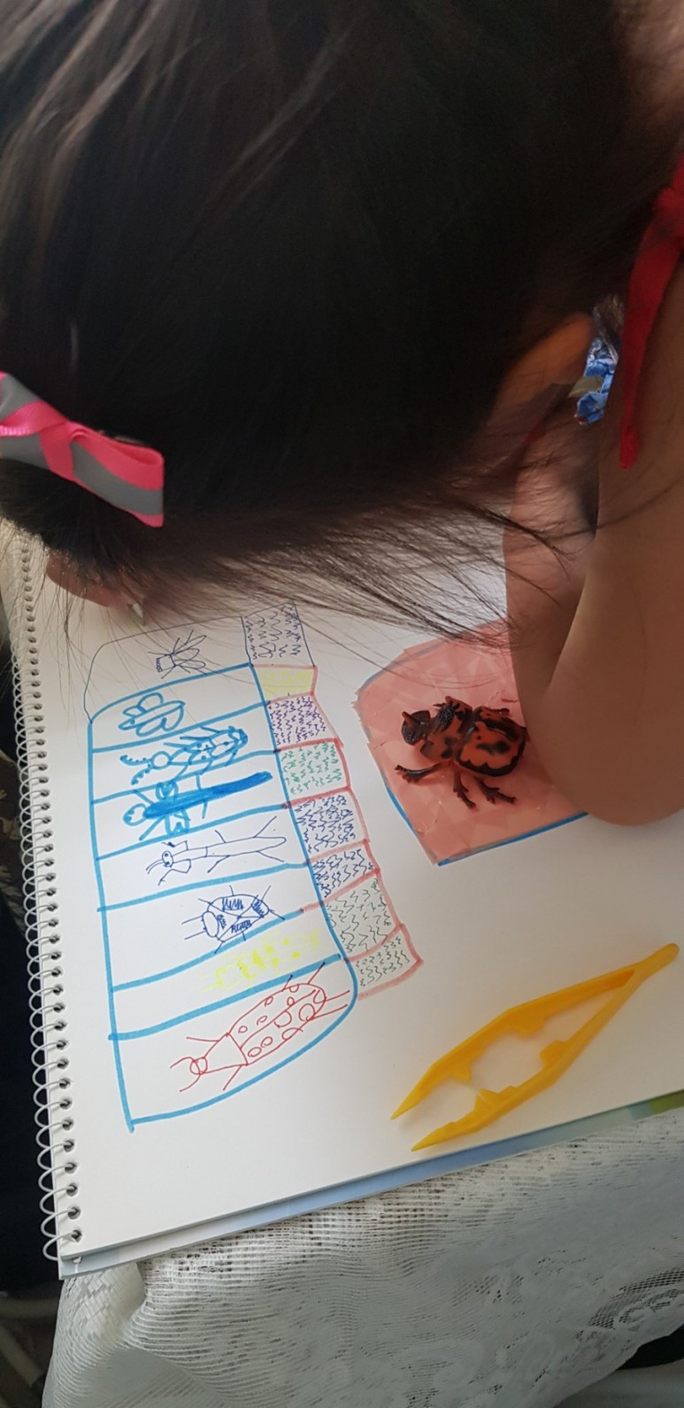 너무너무 좋아하지만 겁이 나 직접 만지지는 못하는 별이에게 좋은 친구가 되어주는 별이의 곤충 장난감. 핑크색 공간에 곤충을 올려놓고 열심히 그리는 중인 별이. 이후에 on/off 버튼을 추가해 그린 것을 보면 저건 처음부터 기계였던 것일까 중간에 마음이 바뀐 걸까. 미래의 곤충 박사가 되고 싶은 별이는 현재 곤충 '놀이 박사'가 분명하다.