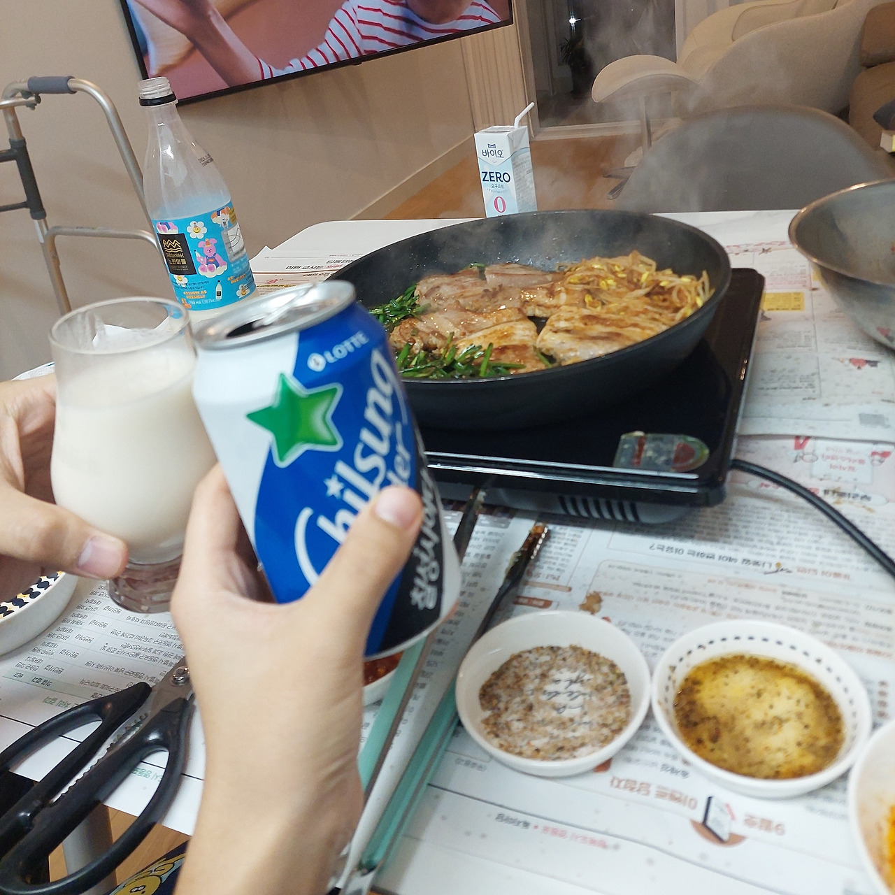 나는 사이다를 들어 올리며 남편에게 얘기한다.