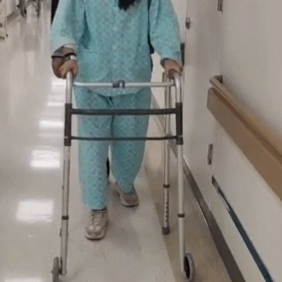 내가 보행기를 잡고 느리게 복도를 횡단하자
