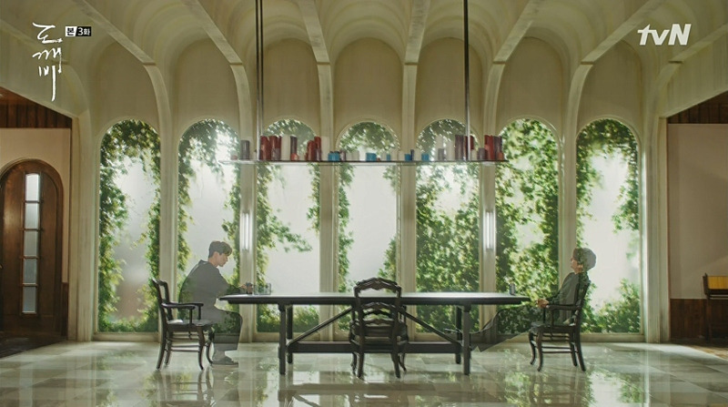 특히 연출의 힘이 돋보이는 장면 중 하나는, 술 취한 김신이 저승사자를 앞에 앉혀두고 문을 들락거리며 은탁이 어딨는지 찾으려 노력하는 장면이다. 3회에 나오는 이 장면은 자칫 지루하고 긴장감이 떨어질 수 있는 부분인데, 앞 씬의 LS(long shot)과 대비되는, MS(medium shot)과 CU(close up)의 빠른 화면과 강약 조절의 호흡으로 김신이 은탁을 보고 싶어 하는 마음을 인상적으로 연출하고 있다. 그 앞 씬은 김신과 저승사자가 전생을 이야기하며 식탁 양쪽 끝에서 술을 마시는 장면으로, 넓은 화각의 LS으로 전체 공간을 보여주고, 똑같은 화면에 빈 공간을 OL(over lap) 시켜 시간의 경과를 한 샷 안에서 길게 보여준다. 그리고 바로 이어지는 빠르고 다양한 컷들...