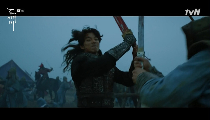 주저하며 침묵하던 김신. "검좀 뽑아줘! 지금!"이라는 대사와 함께, 몽환적이고 슬픈 음악이 시작된다. 김신의 아이러니한 운명적 슬픔을 강조하는 음악은 보는 이로 하여금 인물의 감정에 우리를 동화시킨다. 지난날의 무신이었던 자신의 삶을 회상하는 김신의 얼굴 표정에 더해지는, 높은 음의 피아노 소리 같은 효과음악은 고려시대 장면으로 자연스럽게 회상을 연결시켜 준다. "살아남기 바쁜 생이었다! 역사에 기록되지 않은 시간들이었다! 안간힘을 썼으나 죽음조차 명예롭지 못했다!"는 김신의 내레이션 같은 대사들 사이로, 칼에 베이는 효과음들이 날카롭고, 풍부한 울림으로 전해지고, 높은 음의 선율들은 긴 울림으로 여운을 남기며 흘러나온다. 김신의 비통한 과거 이야기가 더욱 아련하고 가슴 아프게 전해지는 장면이다. 감정이 고조될수록 음악의 사운드가 커지고, 은탁이 김신의 이야기에 눈물을 흘리는 장면에서는, 영롱한 종소리 같은 고음으로, 은탁과 김신이 서로를 진심으로 연민하고, 순순한 마음의 소통을 하고 있다는 것을 아름답게 표현해 내고 있다.
