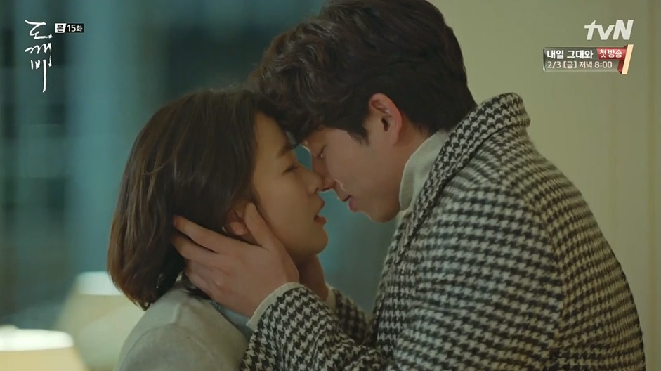 이와 비슷한 점을 지적하는 뉴스 기사들이 종종 눈에 띄는 것을 보니 나만의 생각은 아니었던 듯하다. 어떤 기자는, 작가의 드라마 흐름이 너무 늘어져서 16부작이 아니라 13부 정도의 호흡으로 줄여야 한다는 기사도 있었고, 은탁과 김신의 멜로에 불이 붙지 않는다는 기사도 눈에 띄었다. 13부 정도로 줄여야 한다는 기사는 아마도 필요 없는 씬들이 많아지며, 씬과 씬간에 긴밀함이 떨어지는 부분을 이야기하는 것이고, 은탁과 김신의 멜로에 불이 붙지 않는다는 것 또한, 도깨비 커플의 주된 갈등이 약해지면서 오히려 써니 저승 커플의 애잔함에 멜로 라인이 밀리고 있기 때문에 벌어지는 현상을 지적한 것일 것이다. <태양의 후예>에서도 이와 비슷한 현상이 있었는데, 드라마가 뒤로 갈수록, 주인공 커플에 사랑은 앞부분에 비해 애절함이 덜해지고, 오히려 써브 주인공 커플인 구원 커플의 이야기가 각종 고난과 역경을 겪으며 더욱 애절해지는 현상이 벌어지는 것이다. <태양의 후예>의 경우 구원 커플의 군대 계급, 신분 차이를 극복하는 극적 흐름이 극 후반부에 펼쳐지면서, 메인 커플인 송송 커플의 위기보다 정서적 파급력이 더 커졌다. 그런데, <도깨비>에서도 비슷한 경우가 발생한 것이다. 은탁과 김신은 알콩달콩 사랑을 다져가기만 할 뿐 변화가 없는 사이, 저승과 써니는 운명적 사랑을 애써 감추며 헤어져야 하는 애절함이 표현되며 오히려 후반부엔 저승과 써니의 사랑에 정서적 몰입이 될 수밖에 없었으니, 은탁과 김신의 멜로라인의 무게감은 줄어들 수밖에 없는 것이다. 다행히 <도깨비>에서는 탁월한 결론을 내림으로써 그 정서적 뒤바뀜은 다시 제자리로 돌아오게 되지만, 작가도 도깨비 멜로 라인에, 부족한 2%를 느낀 듯, 29세가 된 지은탁과 김신의 재회 장면에는 유난히 농도 짙은 키스씬과 스킨십이 많은, (시청자로서는 매우 설레는) 부작용이 생기게 된다.