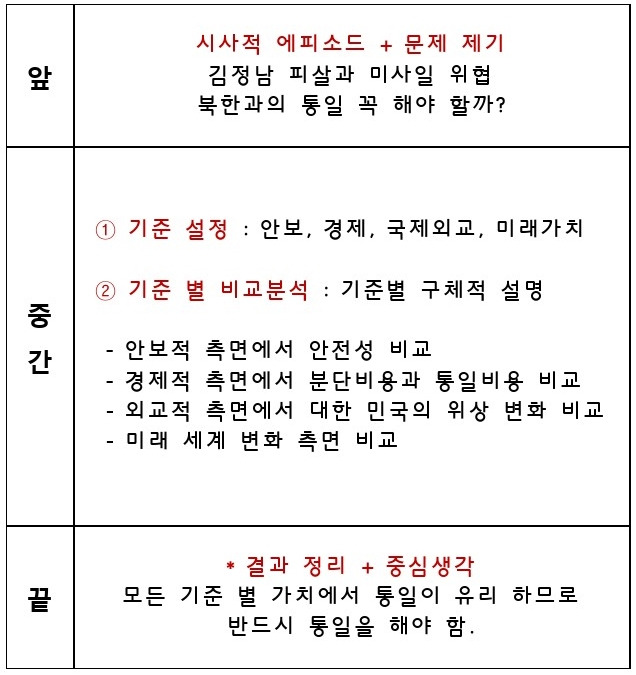 얼마 전 가장 핫이슈였던 '김정남 피살사건'을 서론 앞부분에 두어 관심을 집중시키면서 '통일을 꼭 해야 할까?'라는 논제로 문제제기를 했다. 그리고 글의 본론 시작 부분에 기준을 안보적 측면과 경제적 측면, 외교적 측면과 미래 변화라는 항목으로 분석하겠다고 기준을 정했다. 국가적 차원에서 통일과 분단 상황을 비교해 볼 수 있는 중요한 기준으로 4가지를 정했는데, 이 기준을 어떻게 정했느냐에 따라 글을 쓴 사람의 통찰과 폭넓은 시각이 드러나므로 기준과 항목을 잡는데 유의해야 한다. 그다음은 항목별로 분단 상황과 통일 상황 중 각각의 기준에서 어떤 차이가 있는 지를 분석적으로 살펴보면 되는데, 이때 중요한 점은 같은 기준을 가진 항목으로 비교할 대상을 파고들듯이 세밀히 따지며 비교하는 것이다. 마치 도표화된 내용을 설명하듯이, 체계적으로 설명할 수 있어야 하며, 하나의 항목이라도, 그 평가에 있어서는 풍성한 근거와 기준을 동원해 살펴보는 것이 좋다. 예를 들어 경제적 측면의 비교에 있어서 분단 비용에는 누구나 잘 알고 있는 국방비 예산 문제만 제시할 것이 아니라, 국가적 차원의 금융 거래를 할 때, 휴전 중인 우리나라는 위험도가 높아, 금리가 높을 수밖에 없다는 특별한 사항까지 설명될 경우, 그 분석의 세밀함이 더욱 부각될 수 있다. 본론을 마무리하는 결론엔 분석한 결과가 나오게 되는데, 이것은 자연스럽게 서론에서 문제 제기한 논제에 대한 답변! 즉 중심 생각으로 이어지게 된다. 마무리 중심 생각을 명확하고 단정적인 어조로 강조할수록 더욱 힘 있는 결론이 될 수 있으니 명심하자!