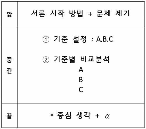 다음은 주장하는 글쓰기 형식 중 비교분석형을 도표화한 것이다. 물론, 앞(서론) 중간(본론) 끝(결론)의 분량 비중은 1:3:1이다.
