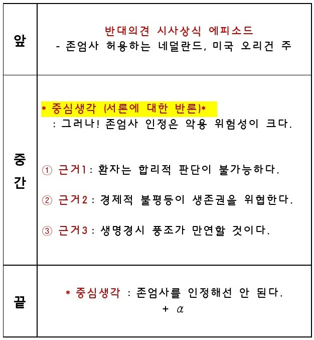 주제는 "존엄사 인정해야 할까?"로, 이번엔 반대 입장에서의 반론 꺾기 개요이다.