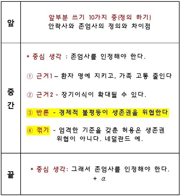 본론에서는 자신의 중심 생각, '존엄사를 인정해야 한다'에 대한 2가지 근거를 차례로 설명한다. 죽음에 대한 자기 결정권은 자신의 명예를 지키는 길이라는 설명과 함께, 가족의 고통도 줄여 줄 수 있다는 점, 그리고 현실적인 면서 장기이식 가능성이 늘어난다는 점을, 본론의 반 정도를 할애해서 근거로 설명한다. 그 뒤에 본론의 반 정도 분량에 반론 꺾기가 들어간다. '존엄사'를 인정해선 안된다는 측의 중요한 핵심 논리는 사람들이 경제적인 이유로 존엄사를 선택하게 될 것이라는 생존권 위험 측면이다. 그 핵심 주장을 간략히 제시하며 반론에 대한 재반론, 꺾기의 단계가 들어가게 된다. 앞서 말한 것처럼, 반론 꺾기는 반론에 대한 해결방안을 제시하거나 반론에 논리적 오류가 있음을 지적, 또는 중요도 측면에서 자신의 주장이 더 타당하다는 주장을 펼치면 된다. 여기서는 네덜란드처럼 '존엄사'의 엄격한 기준을 정하면 경제적 생존권 위협받지 않는다며 문제의 해결방안을 제시하고 있다. 이때 주의할 점은, 반론은 핵심만 간략하게 설명하고, 그에 대한 재반론(반론 꺾기)을 자세히 설명해서 자신의 주장에 힘을 실어야 한다는 것이다. 그러면 결론은 자연스럽게 '존엄사를 인정해야 한다'는 중심 생각을 다시 한번 강조하는 것으로 끝낼 수 있다.