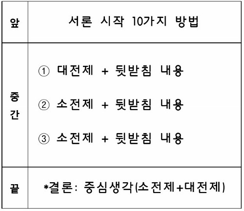 다음은 연역법적 글쓰기 방법을 도표화한 것이다. 물론, 서론(앞) 본론(중간) 결론(끝)의 분량 비중은 1:3:1이다.