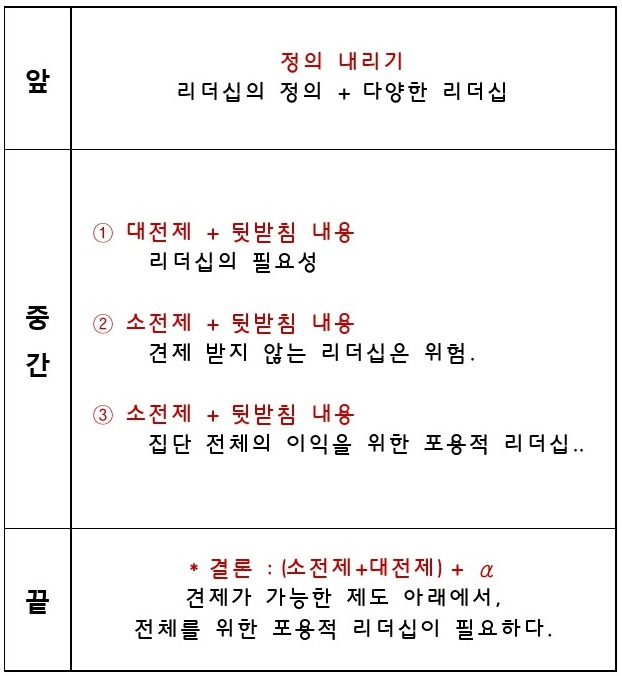 "우리에게 필요한 리더십은 어떤 리더십인가?"라는 논제는 이미, '리더십이 필요하다'는 대전제를 포함하고 있는 논제이다. 그래서 연역법적 글쓰기 형식이 가능하다. 거기에, 리더십에 중요한 요소로 '견제가 가능한 제도가 필요하다'는 것과 '집단 전체의 이익을 위한 포용적 리더십'이라는 구체적 소전제를 제시함으로써 결론의 중심 생각을 논제 의도에 맞는 개요로 완성시켰다.