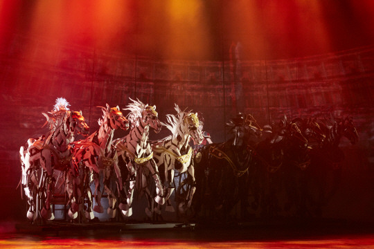 특히나 인상적인 장면은 벤허가 노예로 끌려간 배가 처음 등장하는 장면과 벤허와 마셀라의 마지막 전차 경주 장면이었다. 많은 기사에도 알려진 바와 같이 왕용범 연출자는 전차 경주 무대를 위해 뮤지컬 제작비의 대부분을 쏟아부었다고 한다. 생각해 보면, 영화 속에서 가장 인상적인 장면으로 보이는 것이 전차 격투 장면인 데다, 마셀라와의 마지막 결투이기 때문에 제대로 멋지게 표현해야만 하는 중요한 장면일 수밖에 없다. 영화 속 전차 씬이 치열하고 위험한 긴장감 넘치는 장면이었다면, 뮤지컬 속 전차 경주 장면은, 아름답고, 환상적이며, 심리적인 장면으로 연출된다. 어두운 무대 위, 붉은 조명 사이로, 검은 말과 흰 말의 말발굽이 섬세하게 움직여 달려가고, 8마리 말들이 경주하는 콜로세움 세트 위로 대결하는 벤허와 마셀라의 결투가 상상력을 자극하며 펼쳐진다. 아름답고 놀라운 연출력이다.