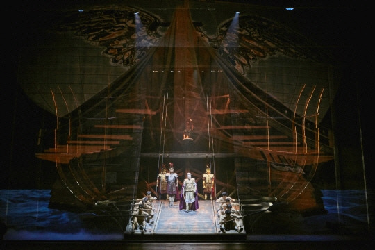 또 벤허가 노예로 팔려간 배는, 무대 장치로 배 안의 모습을 보여주는 것과 동시에, 홀로그램으로 중간 장막에 배 전경을 투사시켜, 복합적 이미지를 표현한다. 이로 인해 중간 장막이 흔들릴 때마다 거대한 바다 위, 출렁이는 배의 역동감이 살아나고, 함선의 위기 상황이 실감 나게 전달되는 효과가 생긴다. 고정된 무대라는 한계를 뛰어넘는 뛰어난 연출력이다. 그 시각적 충만함이 어찌나 좋은지, 그것만으로도 이 뮤지컬을 볼만한 가치가 있지 않을까? 싶은 생각이 들 정도였다.