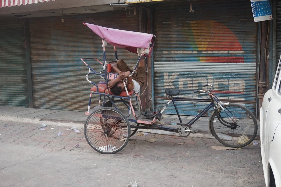 릭샤꾼들의 이야기를 담은 다큐멘터리를 본 적이 있다. 대부분의 릭샤꾼들은 지방에서 돈을 벌러 올라온 가장인 경우가 많다. 그래서 그들끼리 모여사는 곳이 있는데, 그마저도 없는 사람들은 이렇게 자신의 릭샤를 이동하는 집으로 이용한다. 이른 새벽에 나가야 볼 수 있는 장면인데 참 마음이 아프다.