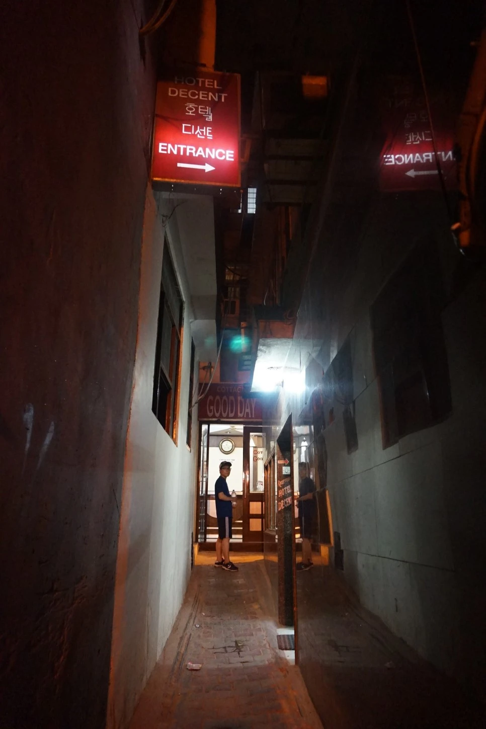 짐을 내려놓고 잠시 나가 망고주스를 한 컵 사마신 후 들어가며 사진을 찍었다. 밤에는 불빛 때문인지 그렇게 으슥해 보이지 않았는데 아침에 보니 동굴로 들어가는 것 같아 보인다.