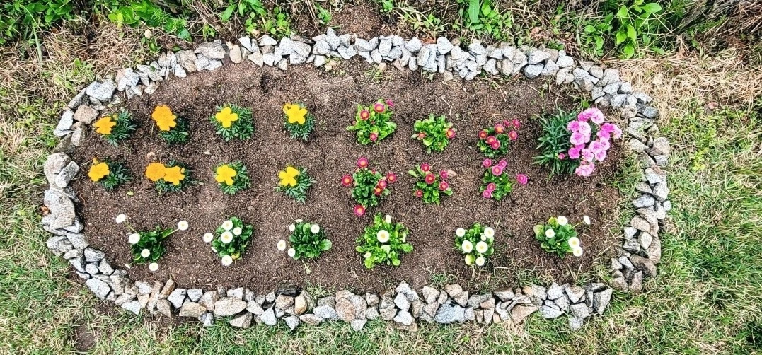 얼른 땅으로 가고 싶어 항의라도 하듯 시들시들 해진 모종을 심고 있으니 옆에서 보고 있던 아이들이 고사리 같은 손으로 직접 돌을 하나씩 주워와 꽃밭틀을 만들어주었다.