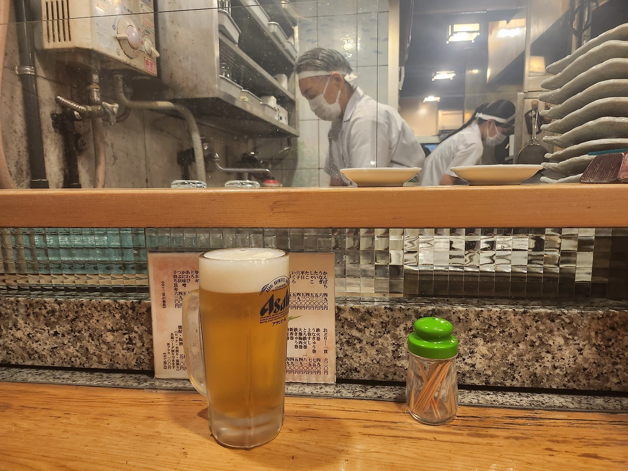 자리에 앉아 메뉴를 살펴보며 무엇을 주문할지 고민했다. 일본 사람들은 음식을 주문하기 전에 맥주부터 마시는 문화가 있다고 해서 "ビールをお願いします。(비루 오 오네가이시마스.)"라고 맥주만 먼저 주문했다. 일본어로 음식을 주문하는 것이 처음이었지만, 차근차근 배운 표현을 떠올리며 말했다. 이어서 먹고 싶은 생선을 선택하고, 스시를 하나씩 주문하며 식사를 즐길 준비를 했다.