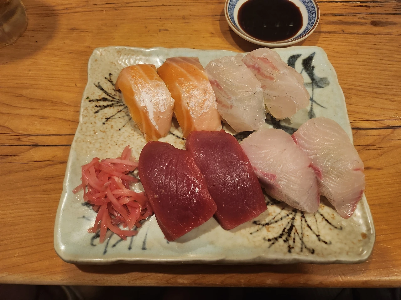 스시 요리사님께서 내 일본어를 듣고 "どちらからいらっしゃいましたか?(도치라카라 이랏샤이마시타카?)"라고 물으셨고, 나는 "韓国から来ました。(칸코쿠 카라 키마시타.)"라고 대답했다. 요리사님은 "日本語が上手ですね!(니혼고가 죠즈 데스네!)"라며 칭찬해 주셨다. 예상치 못한 칭찬을 받으니 정말 기뻤다. 일본어로 소통하며 배운 것이 실전에 적용된다는 느낌이 들었고, 더 자신감을 가지게 되었다.