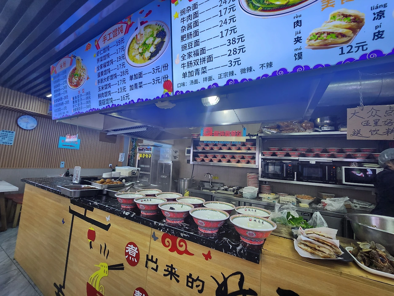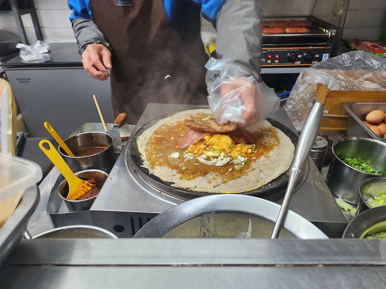 노점 앞, 중국어로 가득한 메뉴판을 마주하고, 하나씩 해석하며 주문했다. 포장을 요청하고, 수저를 하나 더 달라고 했고, 새우 알레르기가 있다는 말도 덧붙였다. 두 가지 맛 중 무엇을 고를지 고민하다 한국 사람들이 주로 먹는 메뉴가 무엇인지도 물어봤다.