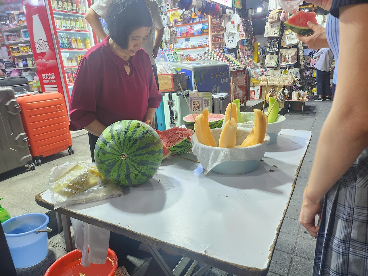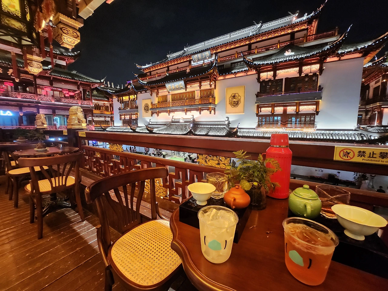 예원의 옛 거리로 가는 길에 덥고 목이 말라서 노점에서 파는 하미과도 사 먹었다. 그리고 그 골목 깊숙한 곳에 자리한 한 찻집. 낮에 왔으면 지나칠 수 있었던 장소였지만, 음악과 조명에 이끌려 들어가게 되었다.