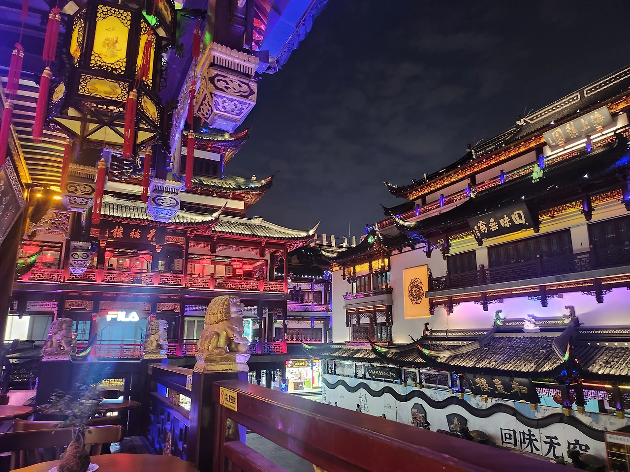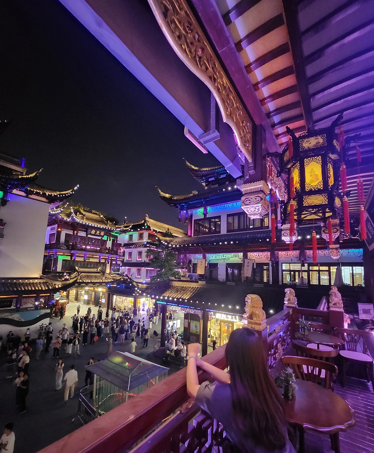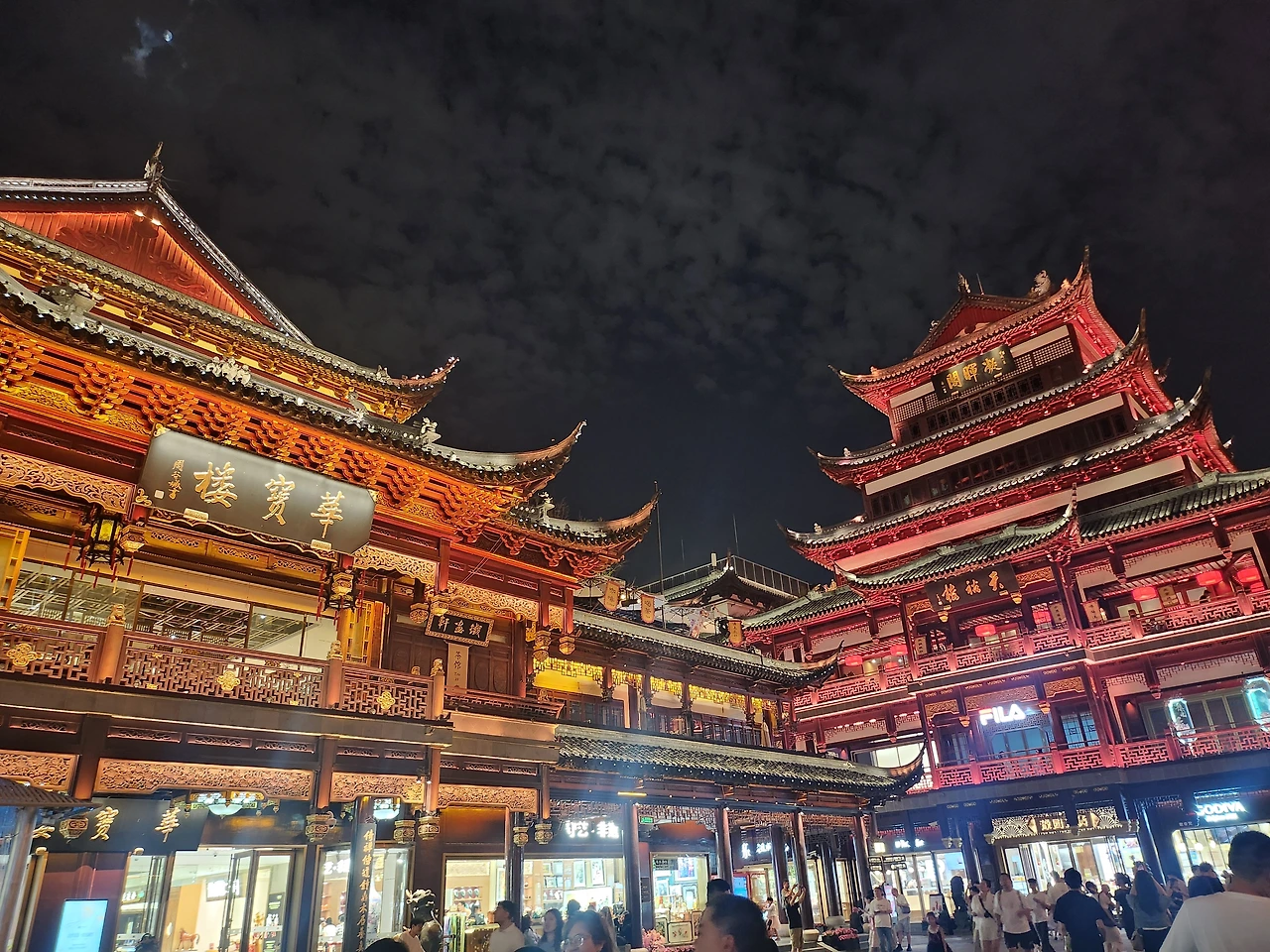 걸어서 이동한 마지막 목적지는 예원의 밤거리. 낮보다 밤이 더 아름답다는 이곳은, 고풍스러운 건물과 조명이 만들어내는 분위기가 마치 무협 영화 속 배경 같았다.