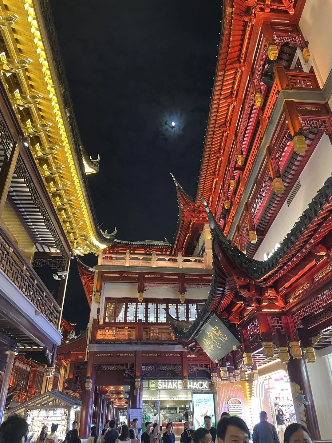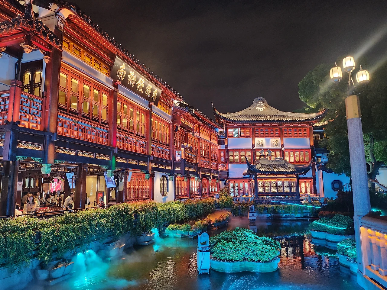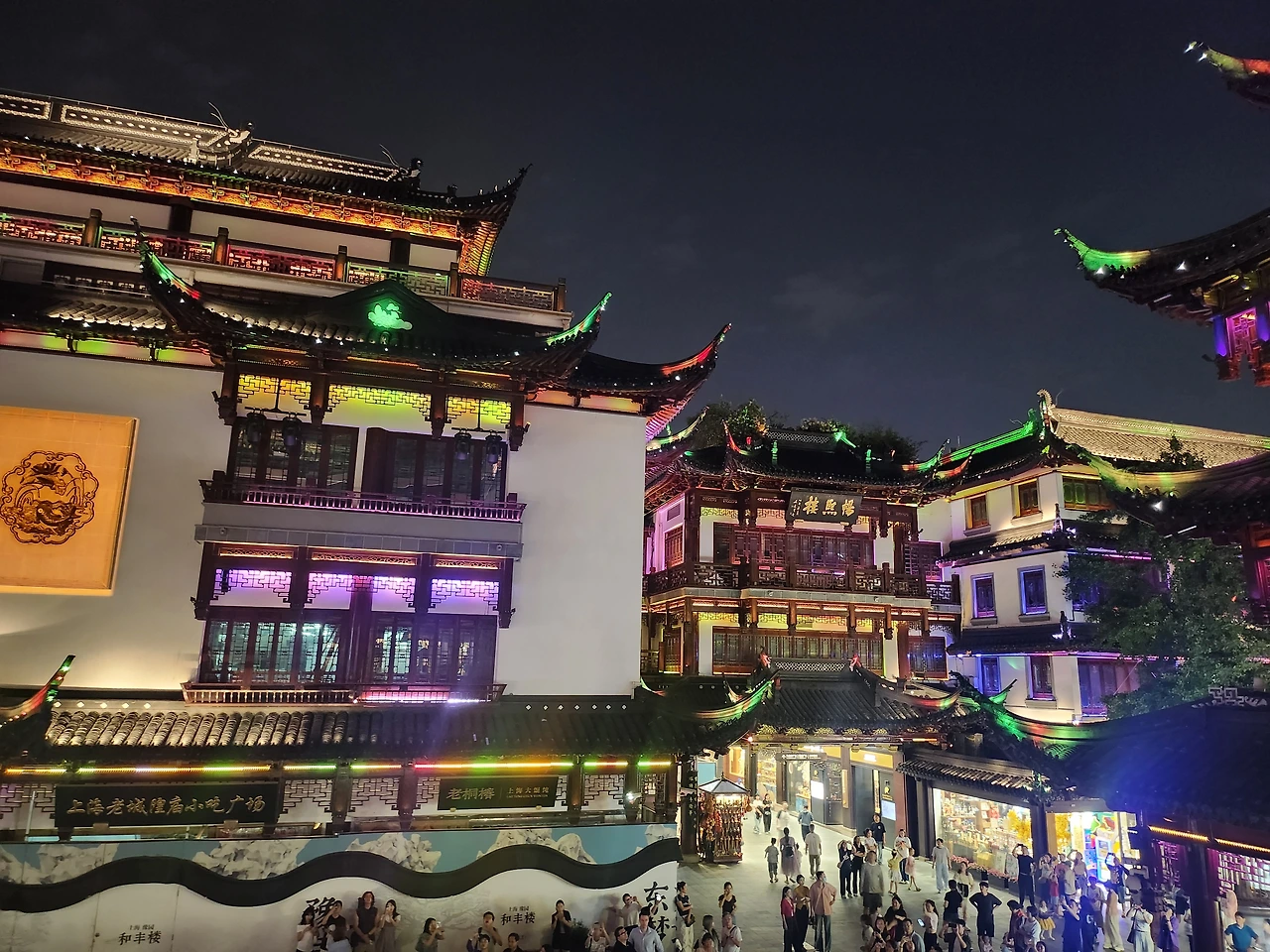 걸어서 이동한 마지막 목적지는 예원의 밤거리. 낮보다 밤이 더 아름답다는 이곳은, 고풍스러운 건물과 조명이 만들어내는 분위기가 마치 무협 영화 속 배경 같았다.