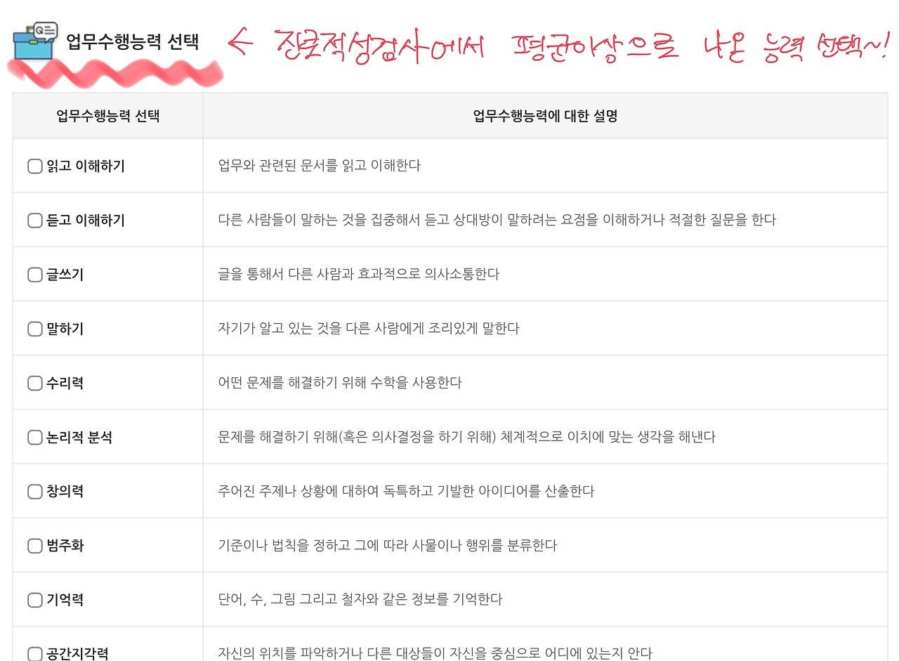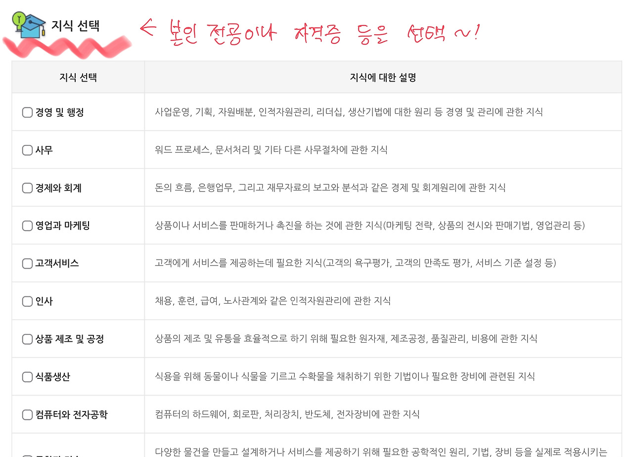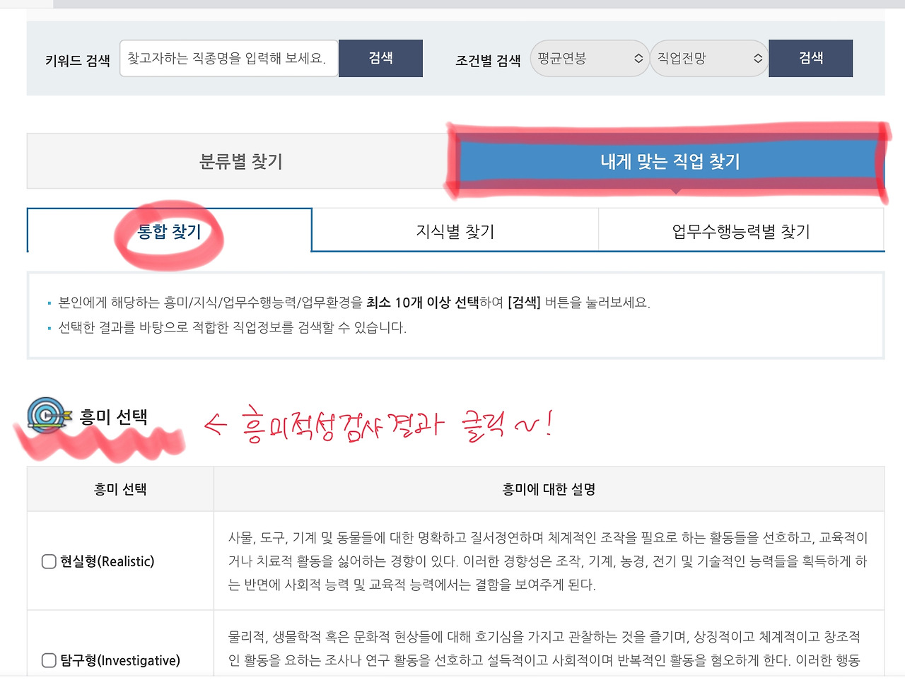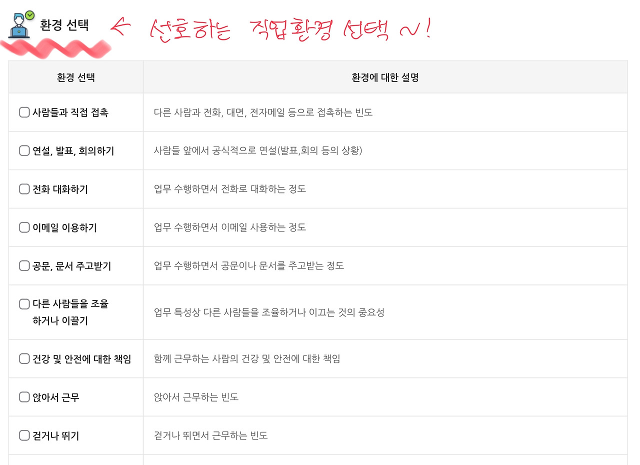 워크넷(work.go.kr) -> 직업진로 -> 한국직업정보에 들어가서 다음의 캡쳐화면들과 같이 자신에게 맞는 지식, 능력, 흥미, 환경을 최소 10개 이상 선택한다.