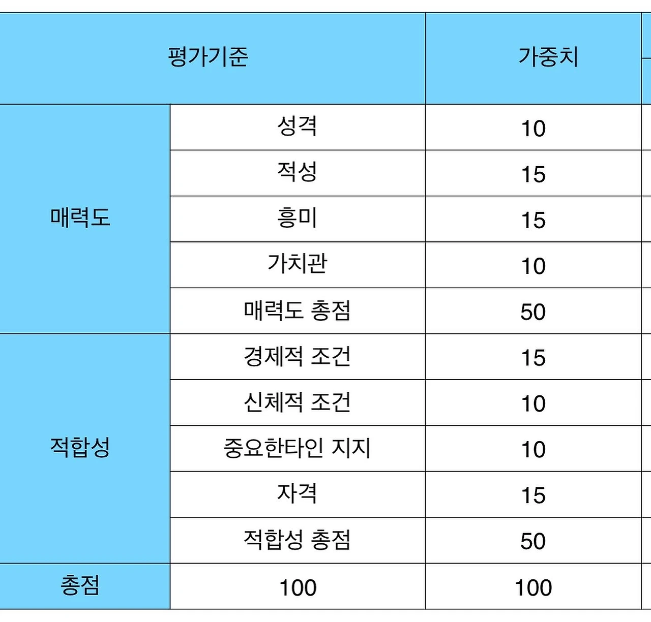 진로의사결정단계에서는 검사결과로 나온 대안들을 다양한 기준으로 평가하여 가장 높은 순위로 나온 직업을 선택합니다.평가기준은 다음 사진과 같이 가중치를 설정하는데 가중치는 개인의 가치관이나 환경에 따라 달라질 수 있습니다.