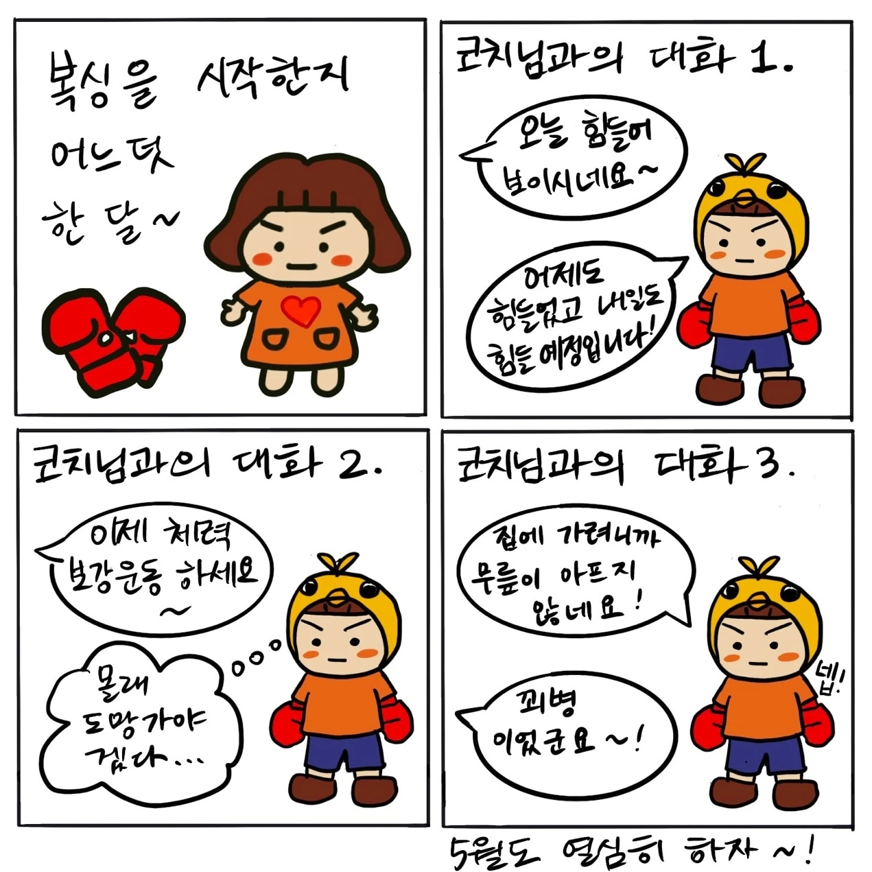 복싱을 가장 많이 그만두는 시기는 한 달, 세 달, 여섯 달, 일 년이라고 한다. 어느덧 한 달이 된 나는 갑자기 기운이 없어졌다. 지금까지는 힘들긴 해도 열심히 하려는 열정이 있었는데 오늘은 축 처진 솜처럼 의지가 생기지 않았다. 그래도 어찌 되었든 간에 날마다 체육관을 나가는 중이고 오늘도 해야 할 분량을 채우고 왔다.