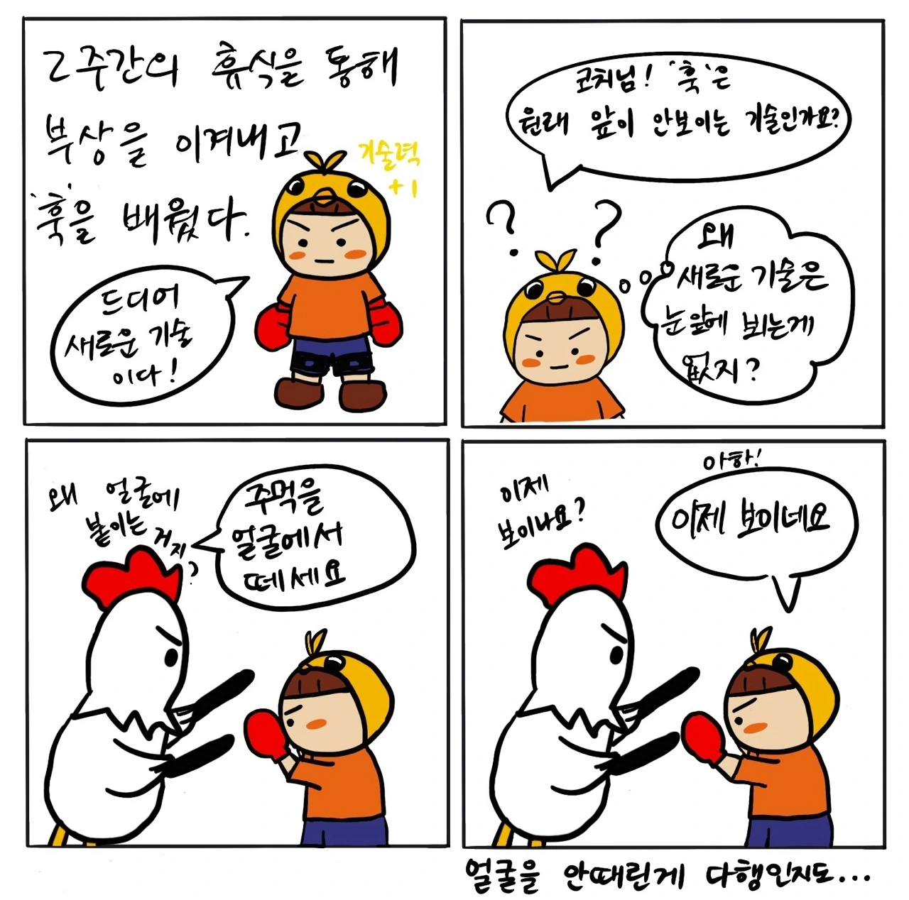 복싱을 시작한 지 10주 정도 되었을 무렵 무릎 통증으로 2주를 쉬게 되었다. 나와 같은 체력을 가진 사람에게 역시 복싱은 무리였나 싶기도 해서 다른 운동을 찾아보기도 했지만 마땅한 운동도 없었을 뿐 아니라 중간에 포기하고 싶지 않았다. 그래서 거의 나았다고 생각이 들었을 때 다시 체육관에 나가기 시작했다.