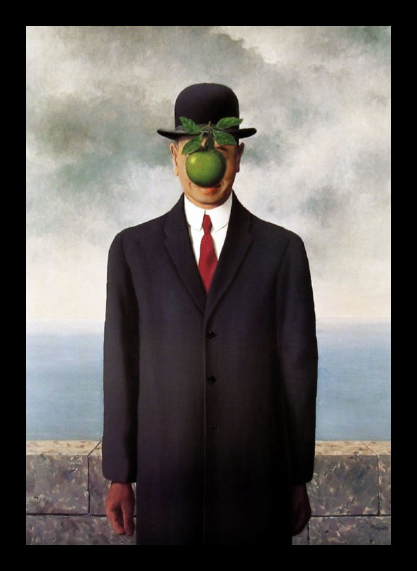 그런데 저 뻔한 의상을 입은 사람의 얼굴이 보이지 않는다. 그도 누군가의 아들이긴 한가 본데 이 남자의 구체성은 정작 파란 사과 뒤로 감춰져 있다.