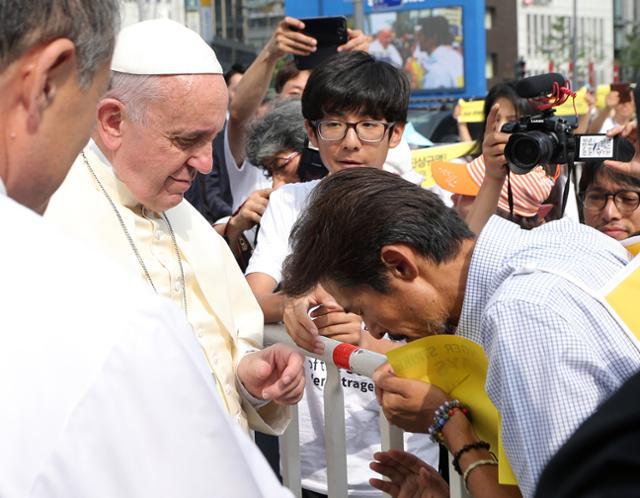 2014년 한국을 방문하여 퍼레이드 카로 광화문 광장을 통과하던 중 세월호 유가족의 호소에 차에서 직접 내려와 그들을 감싸 안았다. 그 밖에도 위안부 피해자들과 쌍용자동차 해고 노동자들을 직접 만나기도 했다. 그 당시 국가의 충분한 위로에 목말랐던 이들은 국경과 종교를 초월하여 사제가 내미는 따뜻한 손길에 큰 위로를 받기도 했다.