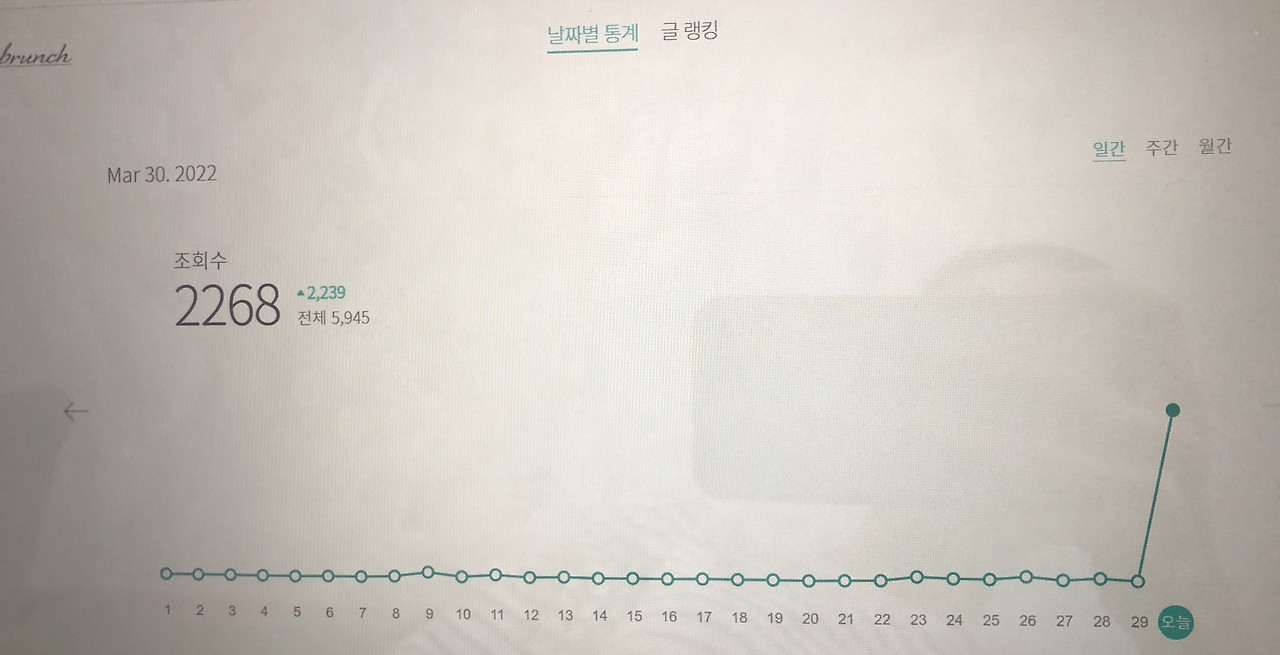 이미 앞서 다른 글에서도 다루었듯이 브런치상에서 주목과 관심을 받는 일의 척도를 라이킷이나 댓글로만 둔다면 너무 슬픈 일이 될 것이다. 이번 떡상 사건도 마찬가지였다. 조회수는 정말 거짓말처럼 늘어가는데 라이킷이 저조해서 되려 자괴감이 잠시 들기도 했었다. 그냥 다음 페이지에 어쩌다가 한 번 떠서 사람들이 지나가다가 뭐 이런 글이 다 있지 하고 들어왔다가 몇 줄 읽고는 다시 뒤로 가기 해서 나가는 거구나, 고작 이런 거였나 싶고 다음에서는 고작 이러라고 메인에 띄워준 걸까, 도대체 메인에 띄어준 저의가 뭘까, 직원의 실수였을까? 생각은 꼬리에 꼬리를 물었다.