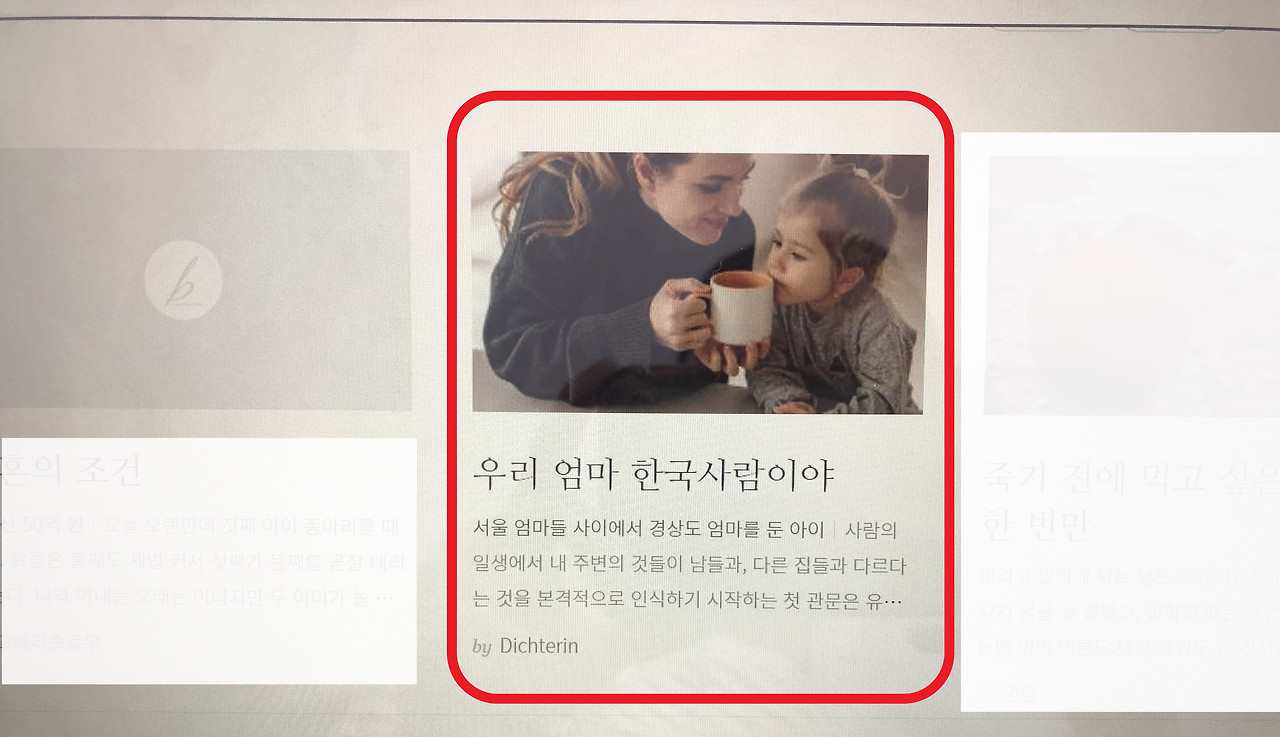 특별히 잘 써야지 하고 힘주지도 않았고 그냥 담담하게, 그러면서도 아주 많이 전부는 꺼내보이지 못하고 이제 조금 용기 내어 내 개인사, 가정사에 대한 것들 조금조금 꺼내놓을 수 있을까 하면서 내딛던 첫 발걸음. 이제 걸음마를 떼고 아장아장 걷기도 조금씩 뜀박질도 하기 시작한 어린아이 같은 나의 아마추어스러움. 그 모든 것들이 녹아있었기 때문이라고 생각한다. 만약 정말로 다음이나 카카오 브런치 담당자의 실수로 노출된 글이었다 하더라도 말이다. 그럼에도 불구하고 나는 이렇게 결론을 짓고 싶다.