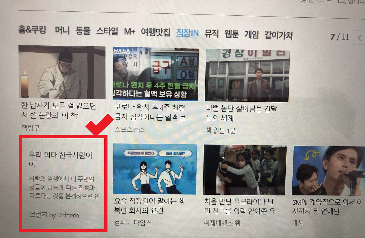 처음에는 다음 페이지의 '브런치' 글이 뜨는 섹션으로 가보았는데도 내 글을 찾을 수 없었다. 그래서 너무 신기하네, 도대체 이 널따란 메인 페이지 어느 귀퉁이에 내 글이 올라갔기에 하룻밤 사이에 이런 비현실적인 조회수를 찍게 된 것일까 싶어서 사이트를 구석구석 뒤지기에 이르렀다. 그 결과, 내 글은 뜬금포 "직장 IN" 섹션에 떡 하니 한 귀퉁이를 차지하고 있는 것이 아니겠는가?