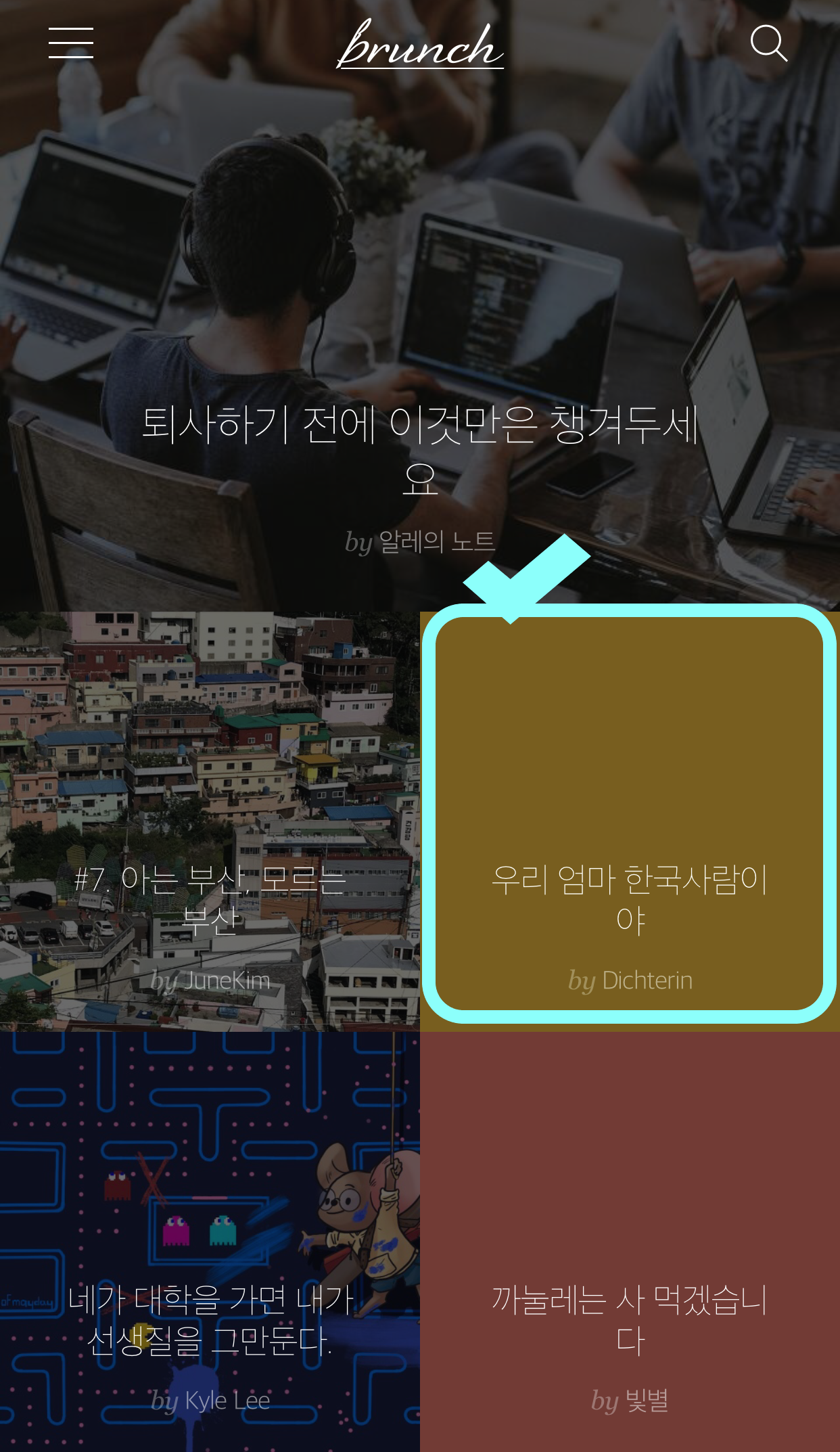 브런치에서는 자라나는 브린이들의 기를 살려주기 위하여 시작한 지 얼마 되지 않은 사용자들의 글들을 랜덤으로 추첨하여 다음 메인에 올려주는가 싶은 생각마저 든다. 이유야 어찌 되었건 우선 그저 감사한 마음뿐이다. 이렇게 소정의 경험을 통해서 더욱더 이 플랫폼에서 글로 활동을 활발히 해달라는 의미로 받아들이기로 했다.