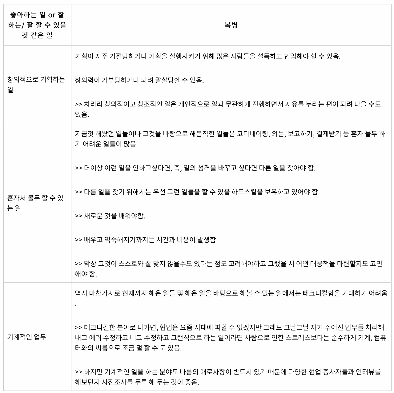 4. 차라리 무에서 유를 창조하는 식의 창의적인 일이 아니더라도, 기계적이고 매뉴얼대로 일할 수 있는 substance 있는 일을 할 수 있는 분야를 찾자.