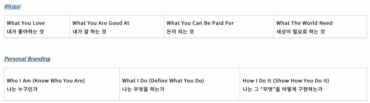 퍼스널 브랜딩과 Ikigai지점 찾기는 그 뒤에 이루어져도 괜찮을 것 같다.