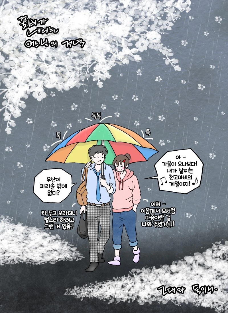 오랜만에 함께 걷는 퇴근길-나뭇잎이 꽃잎으로 변하고,빗방울조차 꼬까옷을 입은 듯 반짝이네요.이런 날도 있어야죠. 매일 치고박고 싸우기도 징-해요.