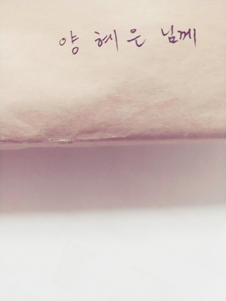 낮은 탁상 테이블 위에 놓여진 소포. 그 위로 적힌 정갈한 글씨.
