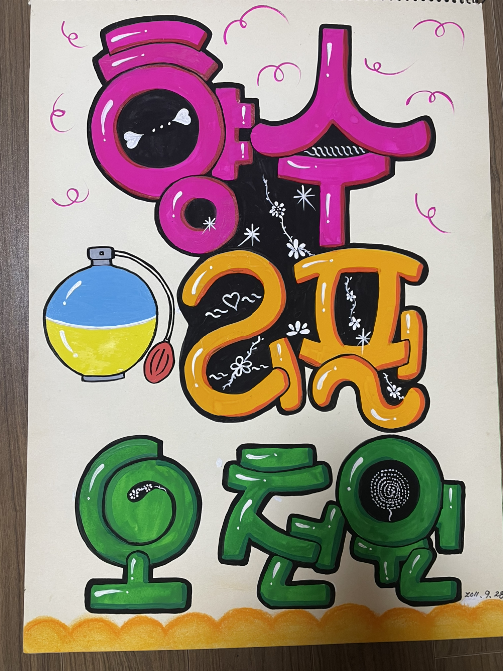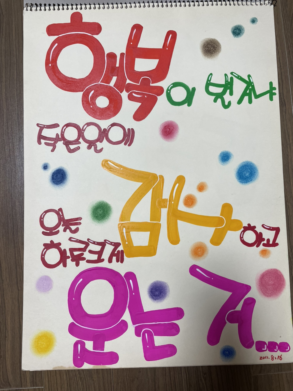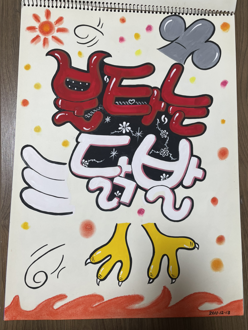 정화가 제일 처음으로 시도한 것은 예쁜 글씨, 그러니까 POP 글씨였다. POP 글씨 쓰기는 포스터물감을 이용해 글씨를 개성 있게 그려내는 것이었는데, 정화가 바쁜 일상 중에서 짬을 내어 작품을 만들기엔 아주 탁월한 것임이 틀림없었다. 정화의 근무 시간은 정말 악랄했다. 아침 9시 반부터 저녁 10시까지. 거의 하루종일 일터에 매달리는 것과 다를 바가 없었는데 그렇더라도 정화의 예술혼은 꺼질 줄을 몰랐다. 정화는 잠을 줄여가면서 글씨를 그려 나갔다. 집에서는 포스터물감이 마를 날이 없었다. 정화는 자정이 훌쩍 넘은 시간까지 아이들을 씻기고, 돌보고, 재우고, 글씨를 그렸다. 그렇지 않으면 견딜 수가 없었다고 한다.
