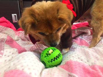 그 후, 실리콘 재질의 양치볼로 바꾸니 말랑말랑한 덕분에 다치는 일이 없었다. 디디가 좋아하는 큐브 간식 몇 개를 틈 사이에 끼우고 그 위에 치약을 발라, 양치질은 물론 치석제거 효과까지 볼 수 있었다.