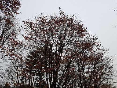 기후 변화에 따른 현상인지는 모르겠으나 요즈음 활엽수 중에는 마른 잎을 땅에 내려놓지 않는 경우가 흔하다. 수목에 대한 지식이 부족해서 그런지도 모르겠지만 분명 예전과는 다르다. 얼마 전까지만 해도 활엽수는 한 계절을 풍미한 후 이파리를 깨끗이 떨어뜨리는 경우가 대부분이었기 때문이다.
