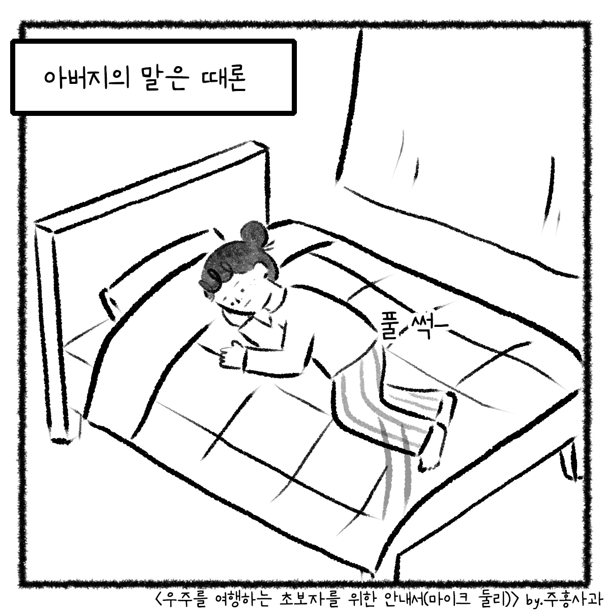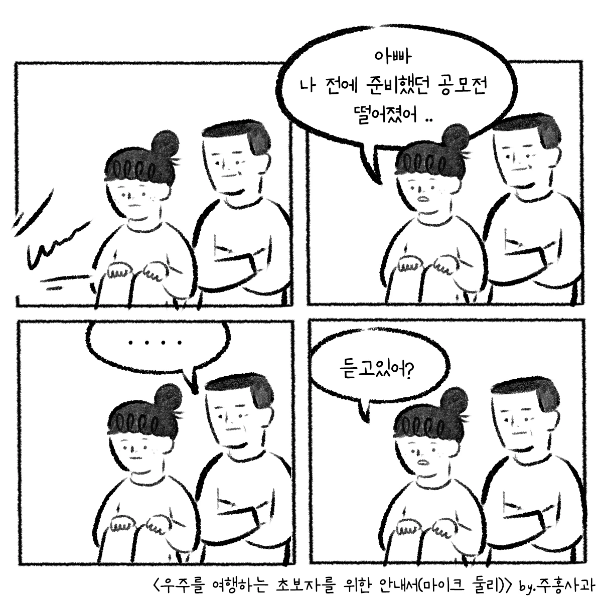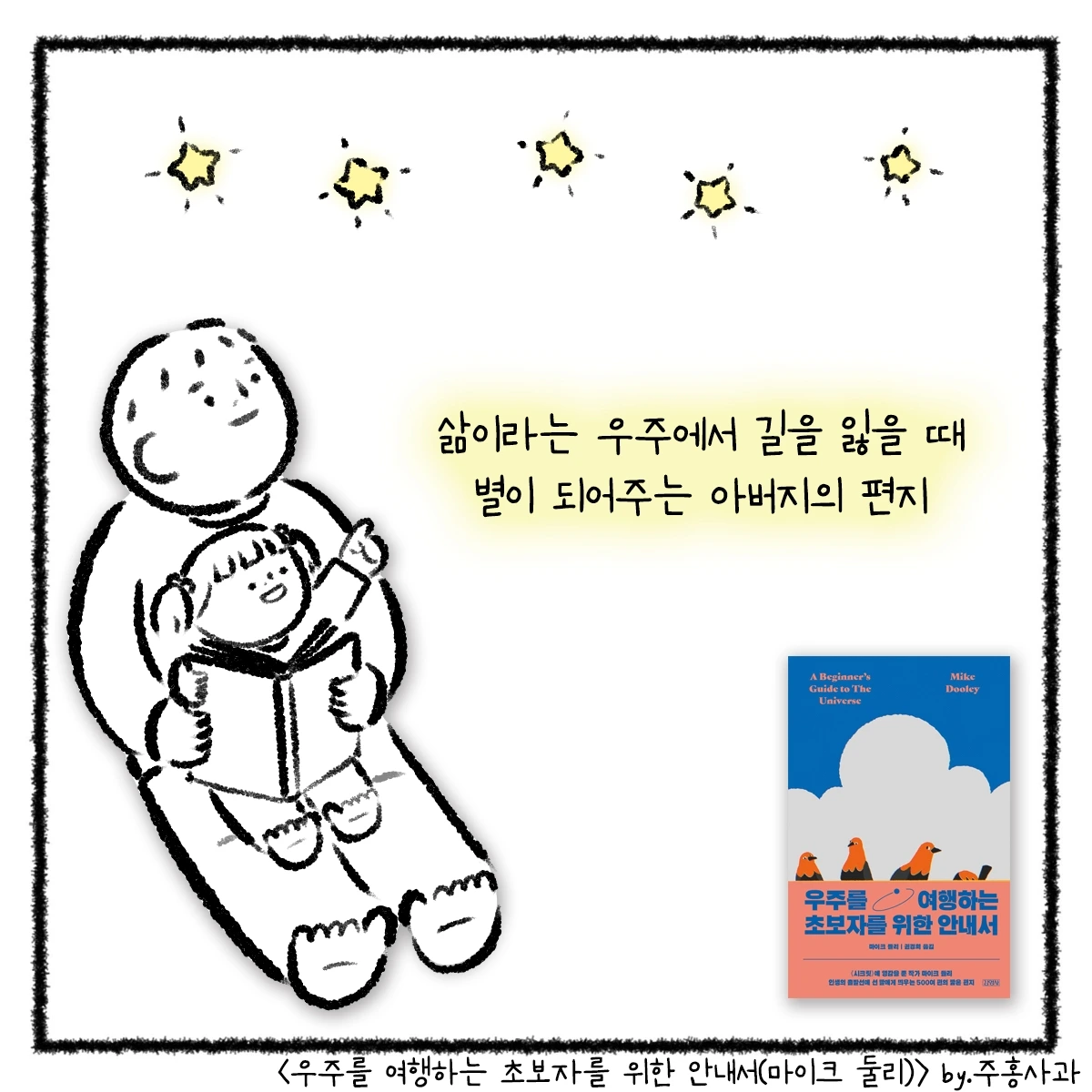 책을 읽으며 떠올랐던 아버지와의 에피소드를 웹툰을 그려봤어요. 책의 저자 마이크 둘리는 오십이 넘어 아버지가 되었고 소중한 딸을 얻었어요. 딸이 태어난 날, '내 인생의 시작점이 되었다'라고 서문에서 언급할 만큼 그의 삶은 완전히 바뀌었고 그는 사랑하는 딸을 위해 편지를 씁니다. 자신이 얼마나 사랑받는 존재인지 알려주기 위해, 딸이 어둠 속에 있을 때 빛이 되어주고 희망이 되어주기 위해.