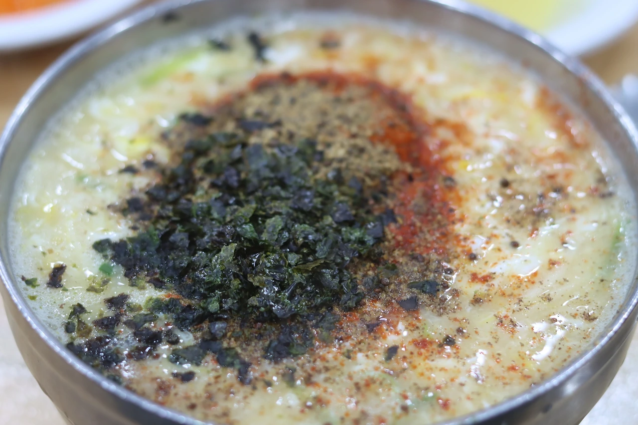 칼국수는 주문하고 얼마 되지 않아 나왔다. 아무래도 인기가 많은 식당만의 장점이지 않나 싶다. 일단 육안으로 보이는 비주얼은 먹음직스럽게 느껴진다. 하얀 연기를 뿜고 있는 그릇 위에는 들깻가루, 고춧가루, 김가루가 수북하게 얹어져 있었다. 열기가 식어지기를 바라며 잠깐의 기다림의 시간을 가져보았다. 그리고 보인 칼국수의 국물은 상당히 걸쭉하게 보였다.