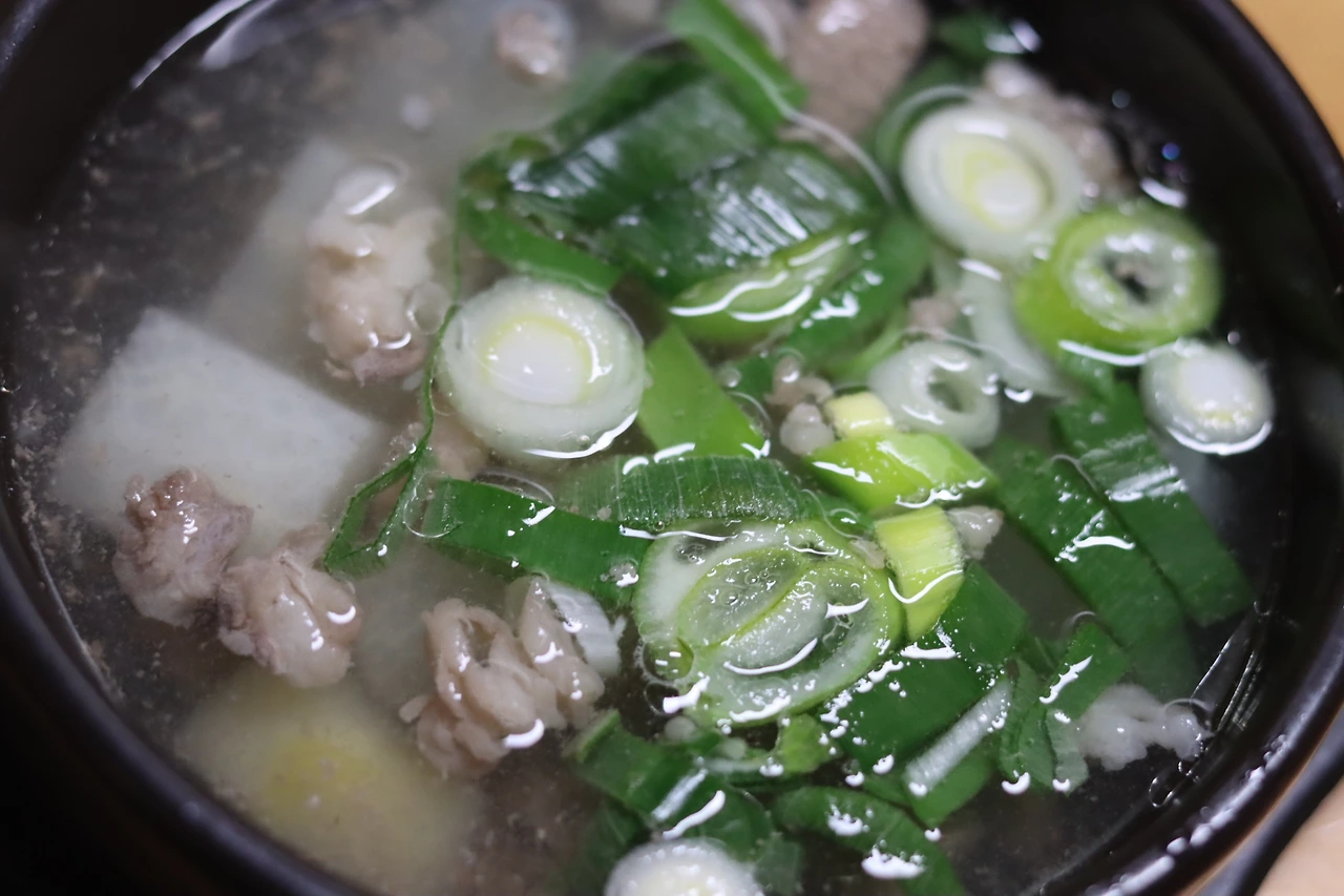 내부에 들어가 고기를 씹어 먹어보았다. 고기는 힘줄 부위가 일부 들어가 있었는데 적당히 씹히는 식감이 만족스러웠다. 밥을 말아 열기가 조금은 식혀 지기를 바라며 이리저리 숟가락으로 섞어 주었다. 찬으로 나온 깍두기는 적당히 익혀져 새콤한 맛이 잘 느껴졌다. 맑은 뭇국의 시원함이 참 만족스럽다는 생각을 주었는데 색다른 방법으로 먹기를 도전해 보았다. 고춧가루를 살짝 넣어 보니 묘하게 육개장이 느낌이 났다. 이 또한 참 맛이 흥미롭고 좋다.