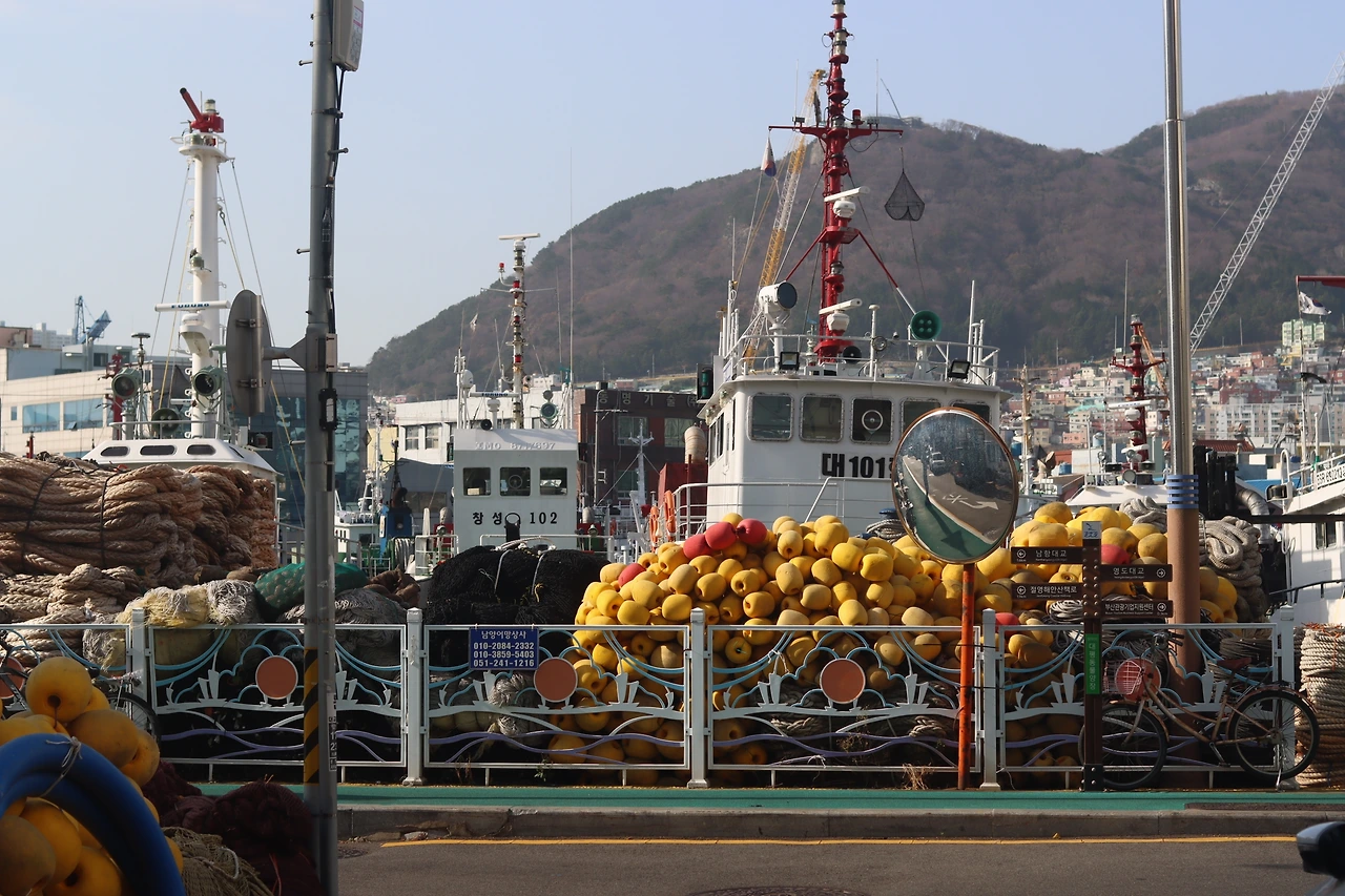 깡깡이마을에는 예전부터 선박수리소가 많았었다. 그래서 배의 녹슨 표면을 망치로 두드려 제거하는 작업을 하는 소리가 자주 들렸다. 바로 그 소리가 깡깡하는 효과음을 내어 이곳을 그렇게 명칭 하게 되었다고 한다. 그렇게 재미난 기원을 알고 정박된 수많은 배를 배경으로 사진을 찍었다. 그리 신경 써서 찍지 않았음에도 꽤나 만족스러운 결과물이 나왔다.