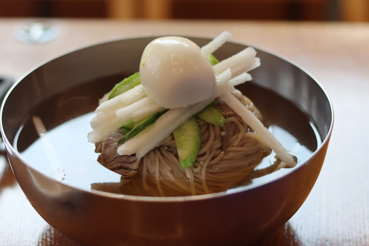 평양냉면은 처음에는 시원한 동치미 국물에 메밀면을 적셔먹는 방식이었다고 한다. 여기서 흥미로운 포인트는 바로 메밀이다. 생각보다 이 재료는 다루기가 쉽지가 않다. 메밀 반죽은 빨리 굳기에 이 것을 활 요하기 위한 방법은 까다롭다. 면자체의 탄력이 적기 때문에 수분에 대한 조절을 신경 쓴다. 물의 온도와 심지어 그날 날씨까지 고려하여 삶는다. 완전히 대치되는 비유는 아니지만 밥을 뜸 들이는 것과 유사한 느낌이 든다.