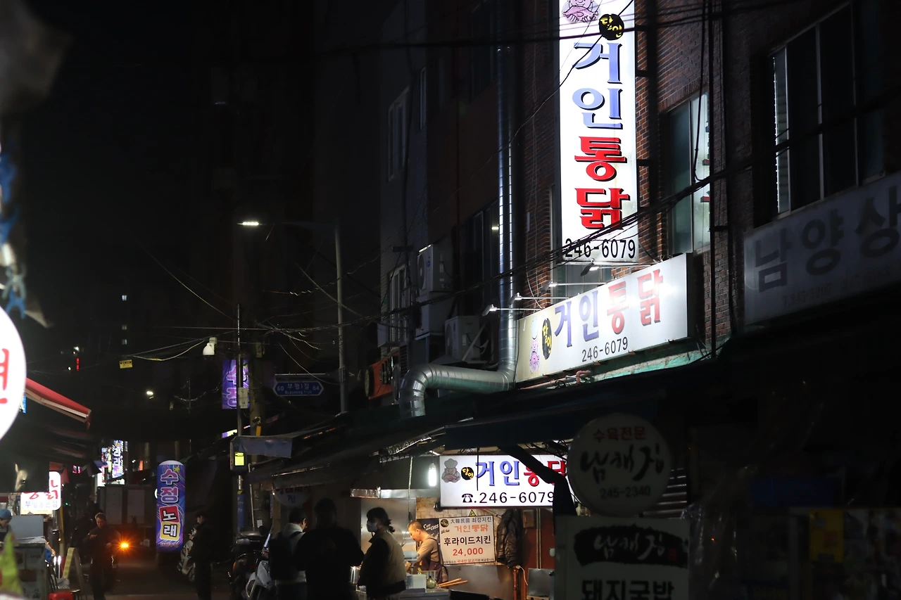 여타의 국내 야시장들을 가보기는 하였지만 이곳만큼 발길이 머무는 것은 거의 없었던 것 같다. 오랜만이라는 텀사이에 공백이 낯설 것 같았는데 막상 다시 와보니 여전히 볼거리와 즐길거리들이 많았다. 그래서 한참을 그 공간에서 벗어나지 못하고 구경을 하였다. 그러다 아차 하는 마음에 가보야 할 장소를 상기하였다. 그렇게 시장에서 벗어나 조금은 으스스한 골목으로 들어가 한 가게 앞에 도착하였다. 거인통닭이라는 상호명을 보고 설렘과 미소가 지어졌다.