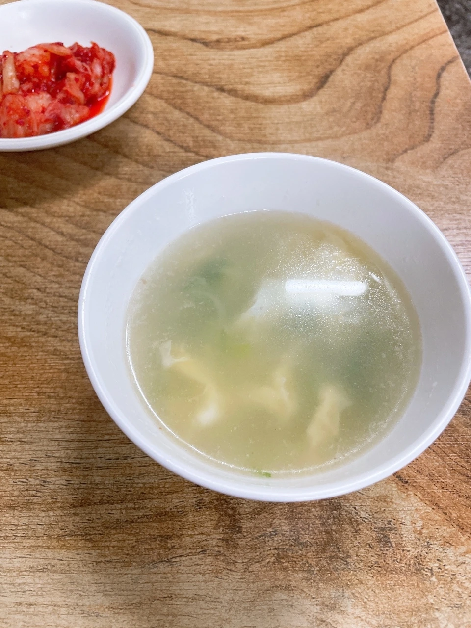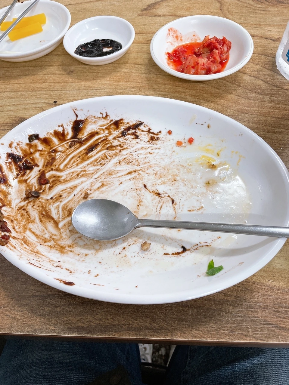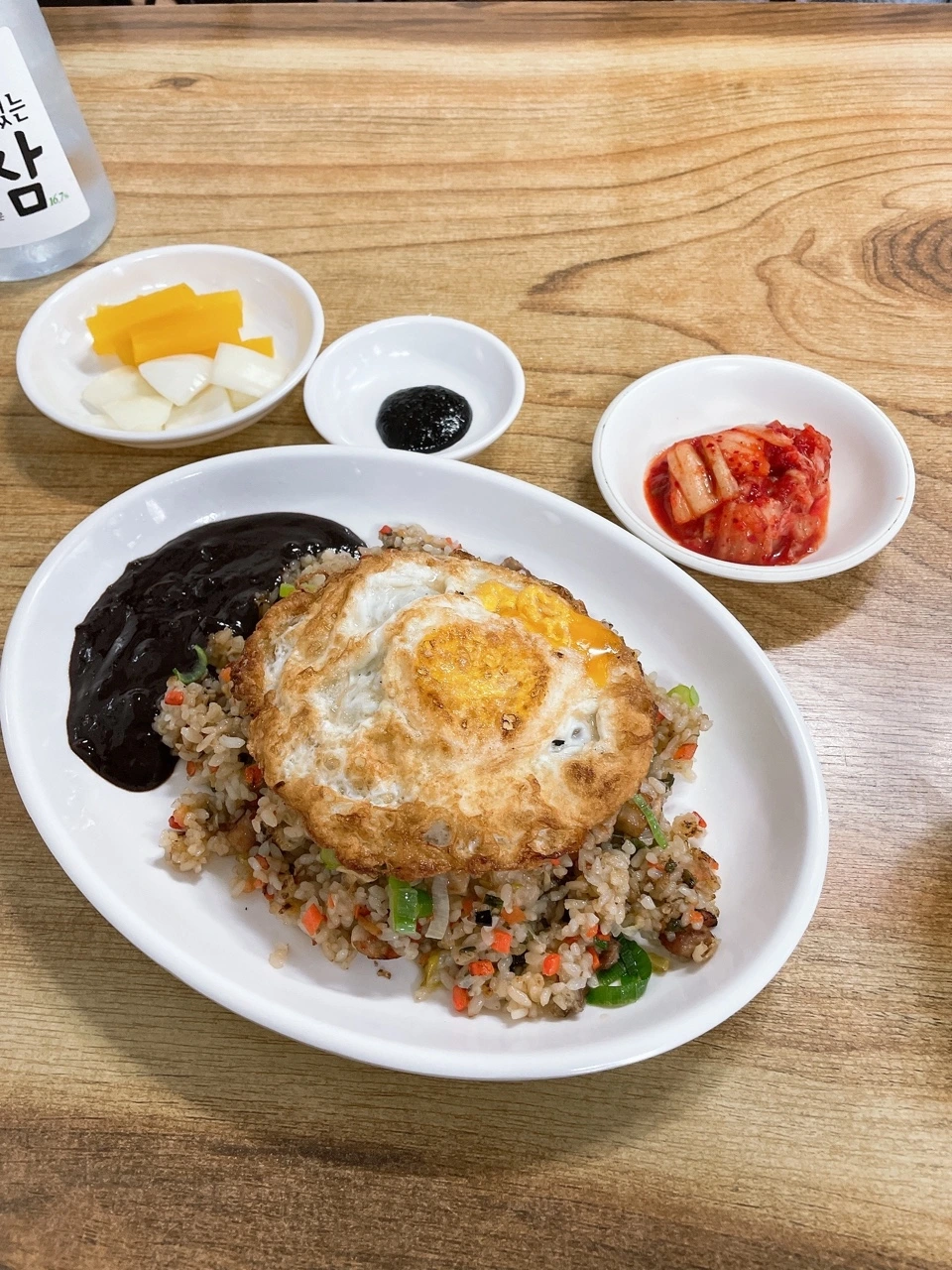 한 톨 한 톨 기름에 코팅된 밥알이 기름져 보였지만 그리 느켜지지않고 계란 노른자의 비벼져서 고소한 맛이 났다. 춘장을 곁들여 한입 다시 입으로 넣었다. 짠맛이 강했다. 이래서 춘장을 조금 주었구나라는 탄식을 하며 반찬으로 곁들여져 나온 계란국을 먹었다. 꽤나 이 짠맛을 중화시키는 힘을 발휘하는 국이 매력적이었다.